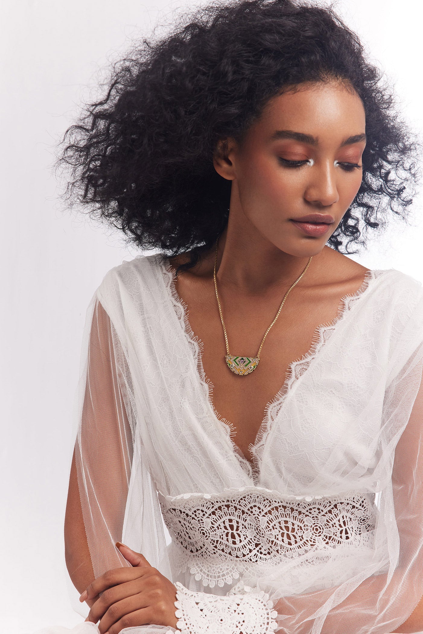 A poetic interplay of a half-moon motif, intricate enamel work, and semi-precious stones makes this a truly exquisite necklace.