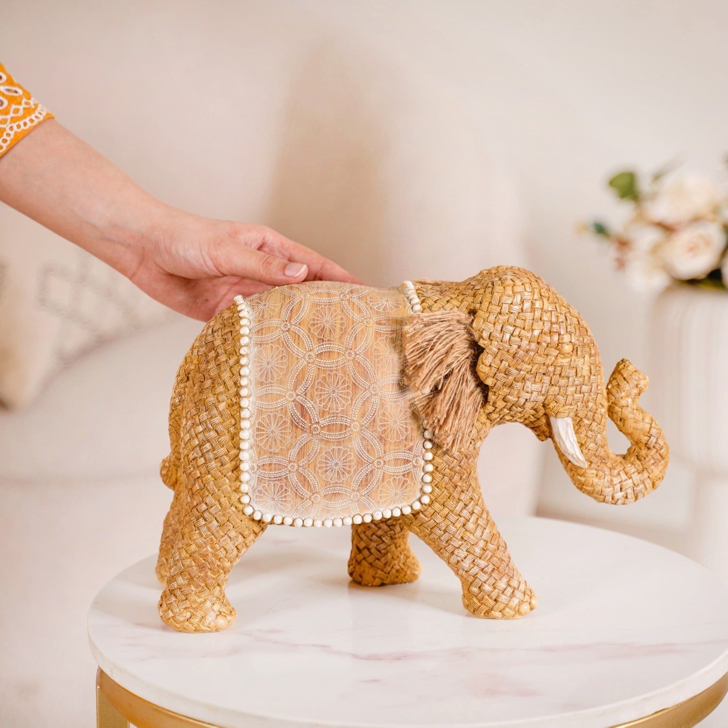Picture the vast expanse of golden grasslands stretching as far as the eye can see, where the air is imbued with the rhythm of life and the whispers of ancient wisdom. Now, what if we told you we've got something to help you bring a touch of the Savannah to your abode? Say hello to our rustic elephant decor showpiece, the missing piece that perfectly captures the majestic nature of these soft giants. Crafted from high-quality resin, this showpiece is both durable and sustainable. But its unique features make this decor object a must-have in your decor collection. With a chic woven textured surface and an ornate floral engraving gracing its back, each delicate detail tells a story of elegance and grace, mirroring the beauty of the Savannah's wilderness. The gentle sway of the jute-crafted ears only adds a whimsical charm. Furthermore, elephants symbolise strength, wisdom, and prosperity, thereby, adding this sculpture to your space creates a sense of harmony and abundance. Now that you know, add this to your cart so you can bask in the majesty of nature's grandeur, right in the heart of your own sanctuary.