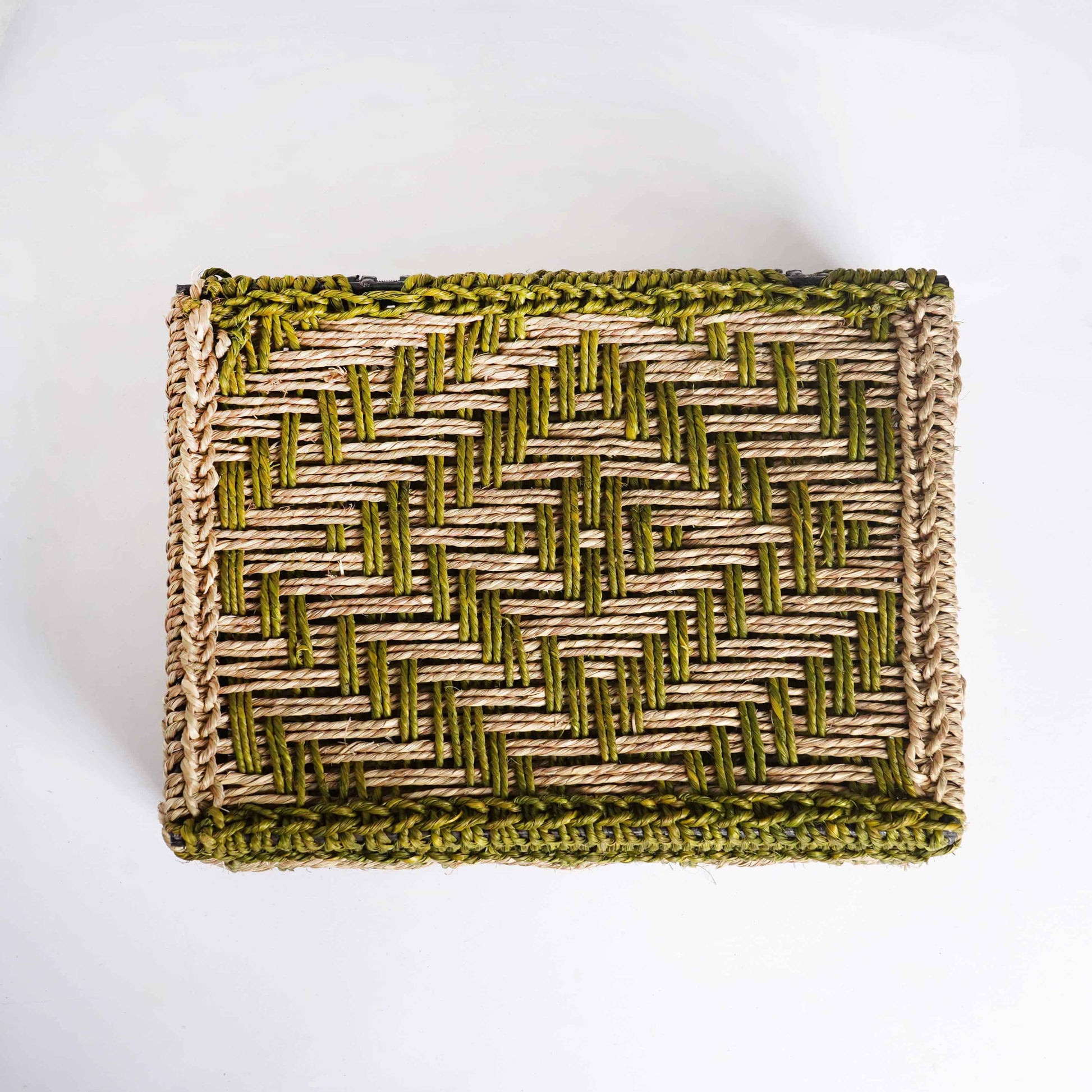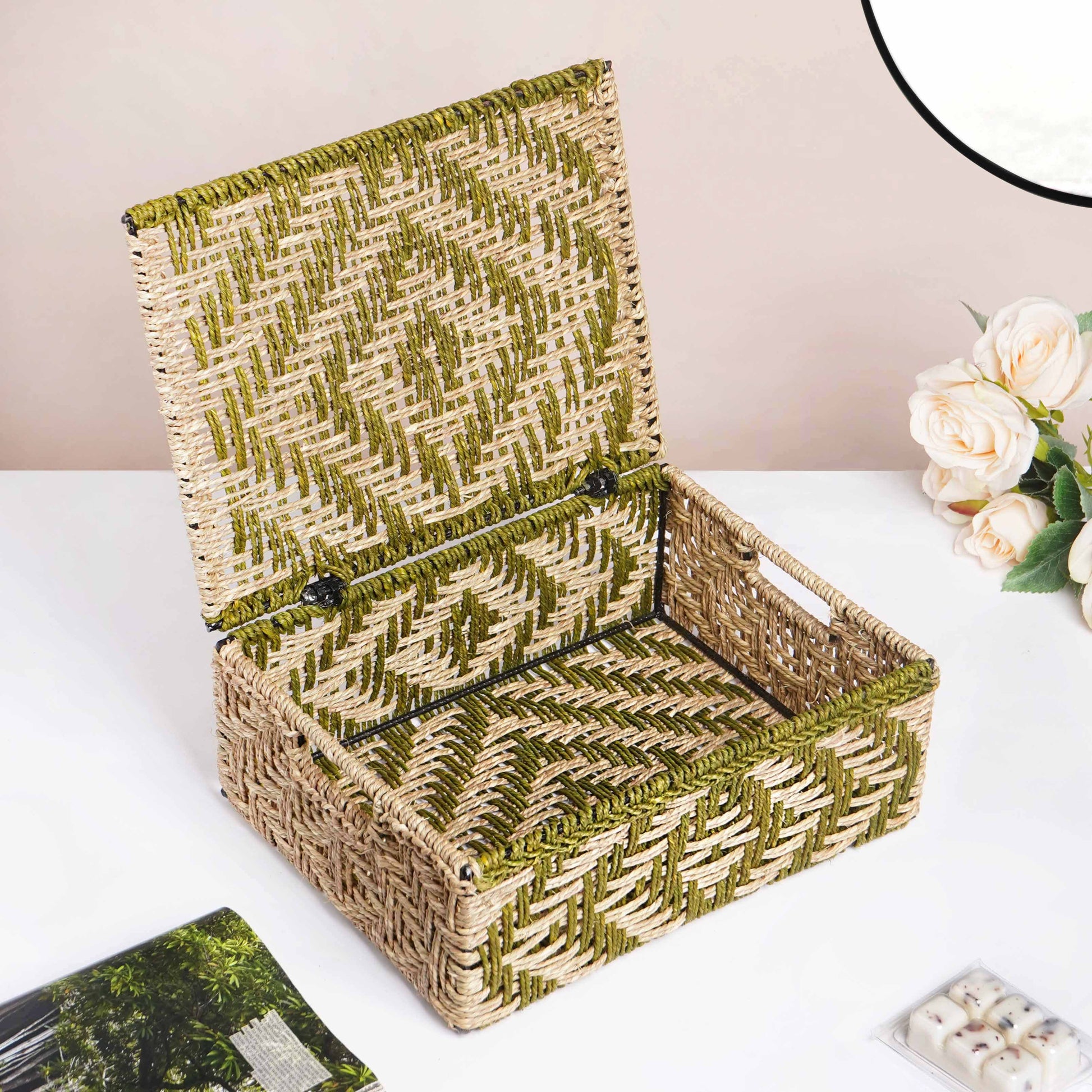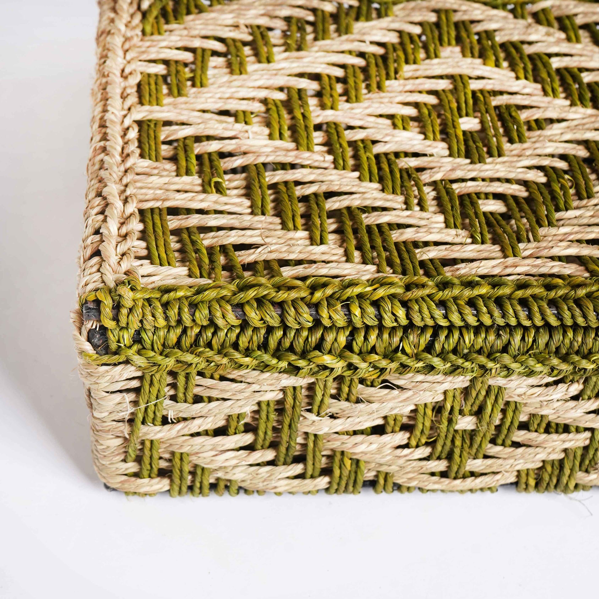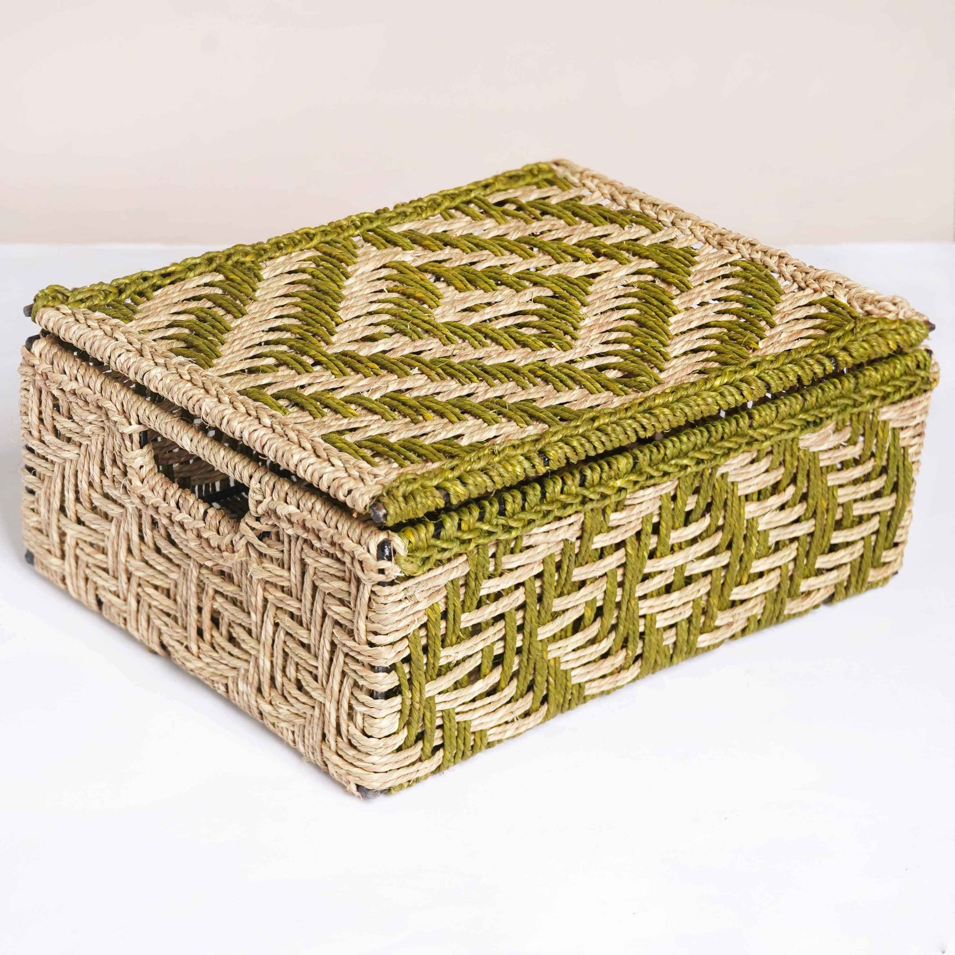 Design: Inspired by the serene beauty of nature and the art of traditional weaving, these sabai storage baskets bring a touch of rustic charm and modern functionality to your home. Crafted from organic sabai and iron, the storage baskets showcase a harmonious blend of materials. Taking cues from natural landscapes, the storage organizers feature vibrant grass-green hues complemented by sabai's naturally earthy tones that weave together to create an intricately captivating diamond pattern. The attached flap lid and cut-out handles on the sides offer a practical touch, making them easy to use and transport.