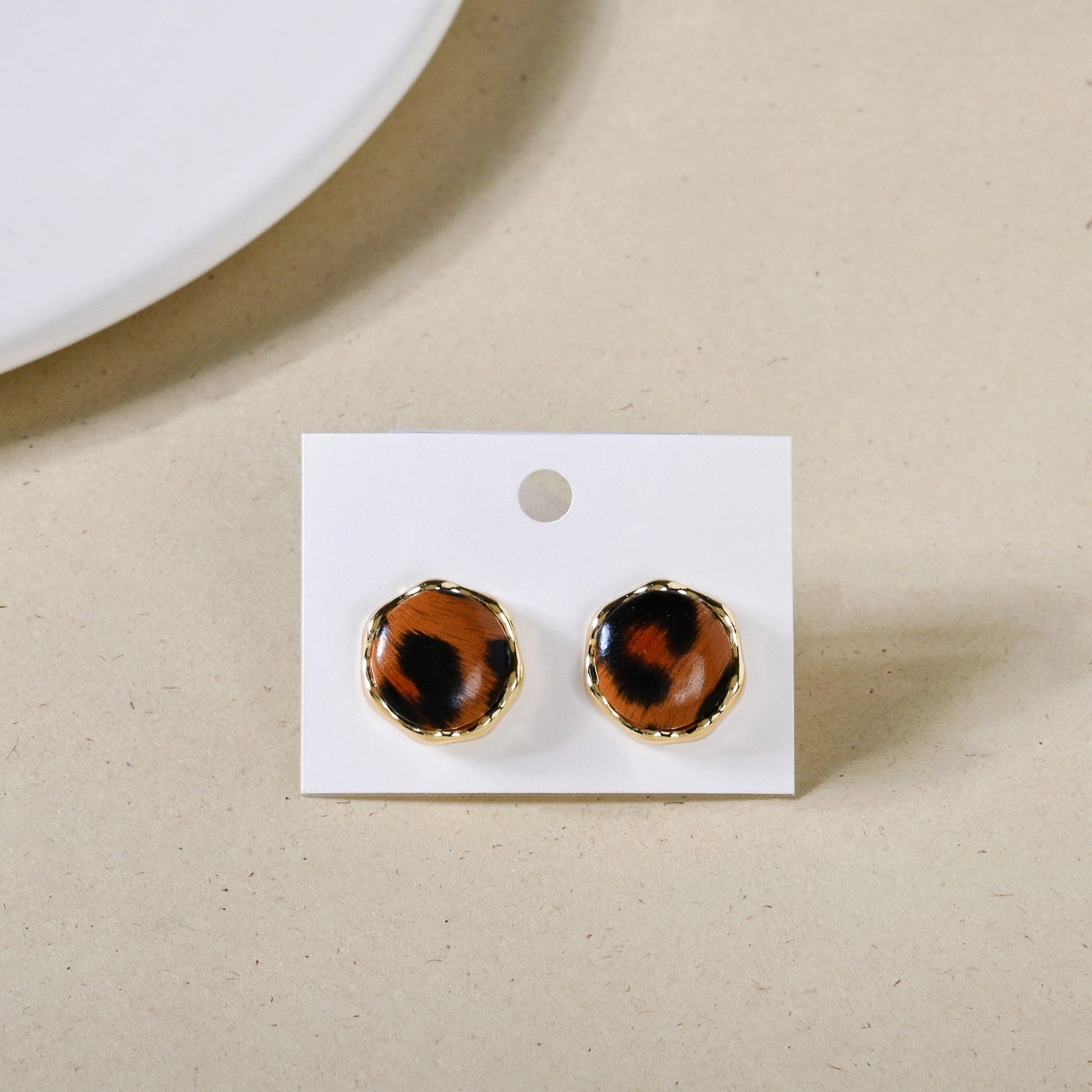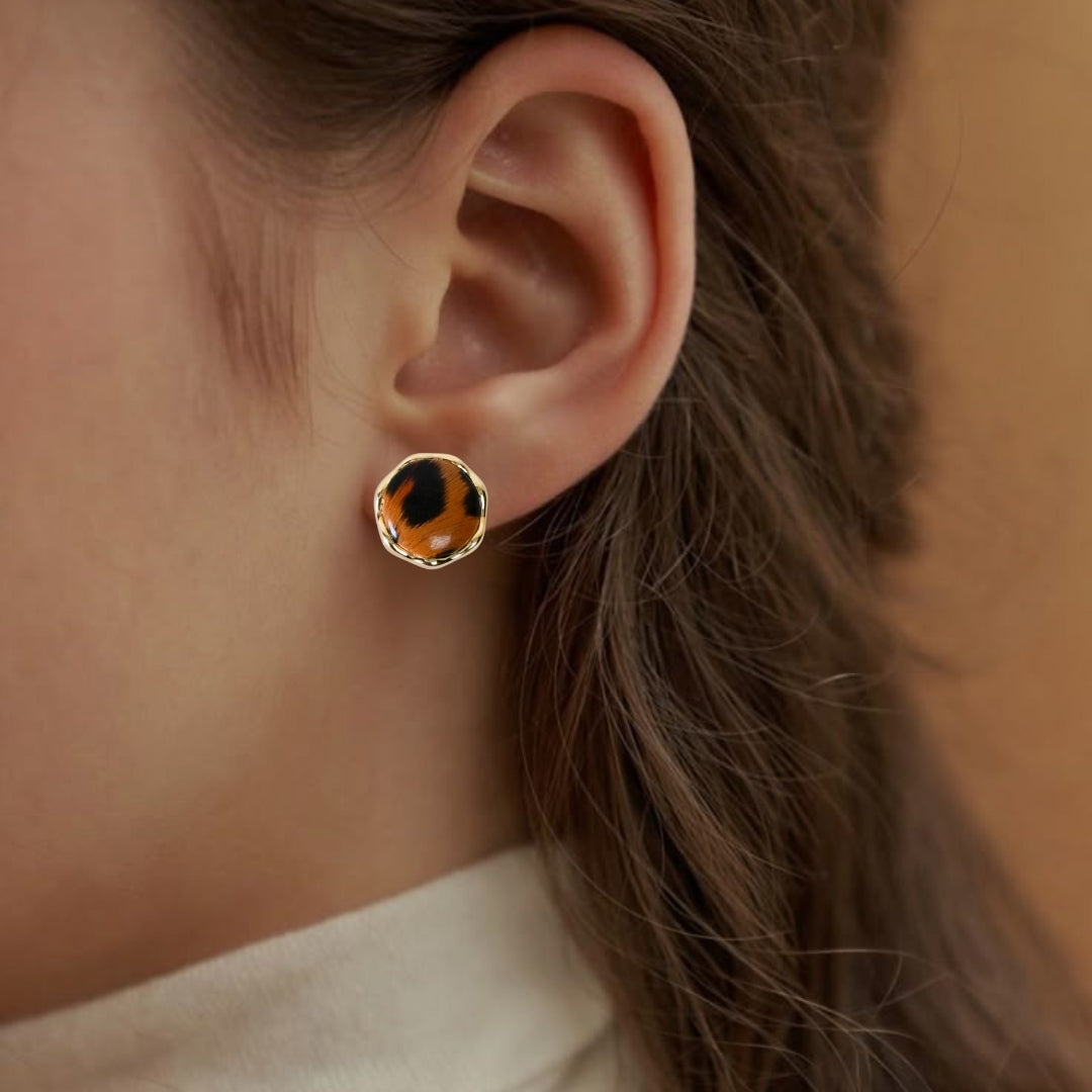 Inspired by nature’s untamed beauty, these resin studs feature a warm brown hue adorned with striking black animal prints. The gold metal border adds a refined contrast, bringing a touch of elegance to the bold, wild design. Perfect for those who want to make a statement, these studs effortlessly combine earthy charm with a sophisticated edge, making them a versatile addition to any outfit.