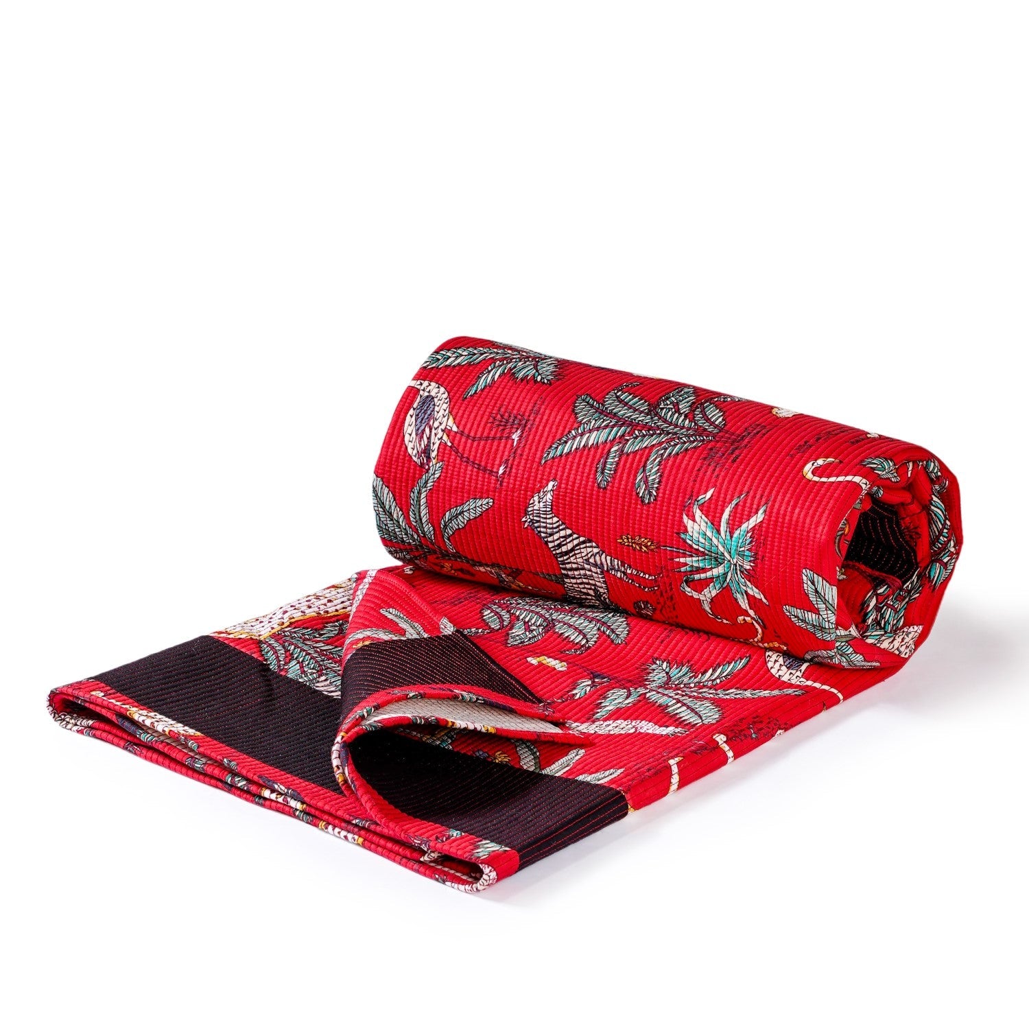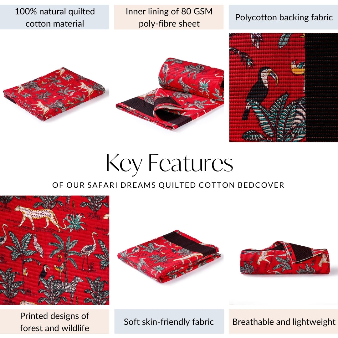 Design: The cotton bedcover features a lively jungle and wildlife print set against a striking red backdrop, making it a captivating centrepiece for your bedroom decor. The quilted texture enhances its visual appeal while adding a layer of warmth and comfort.