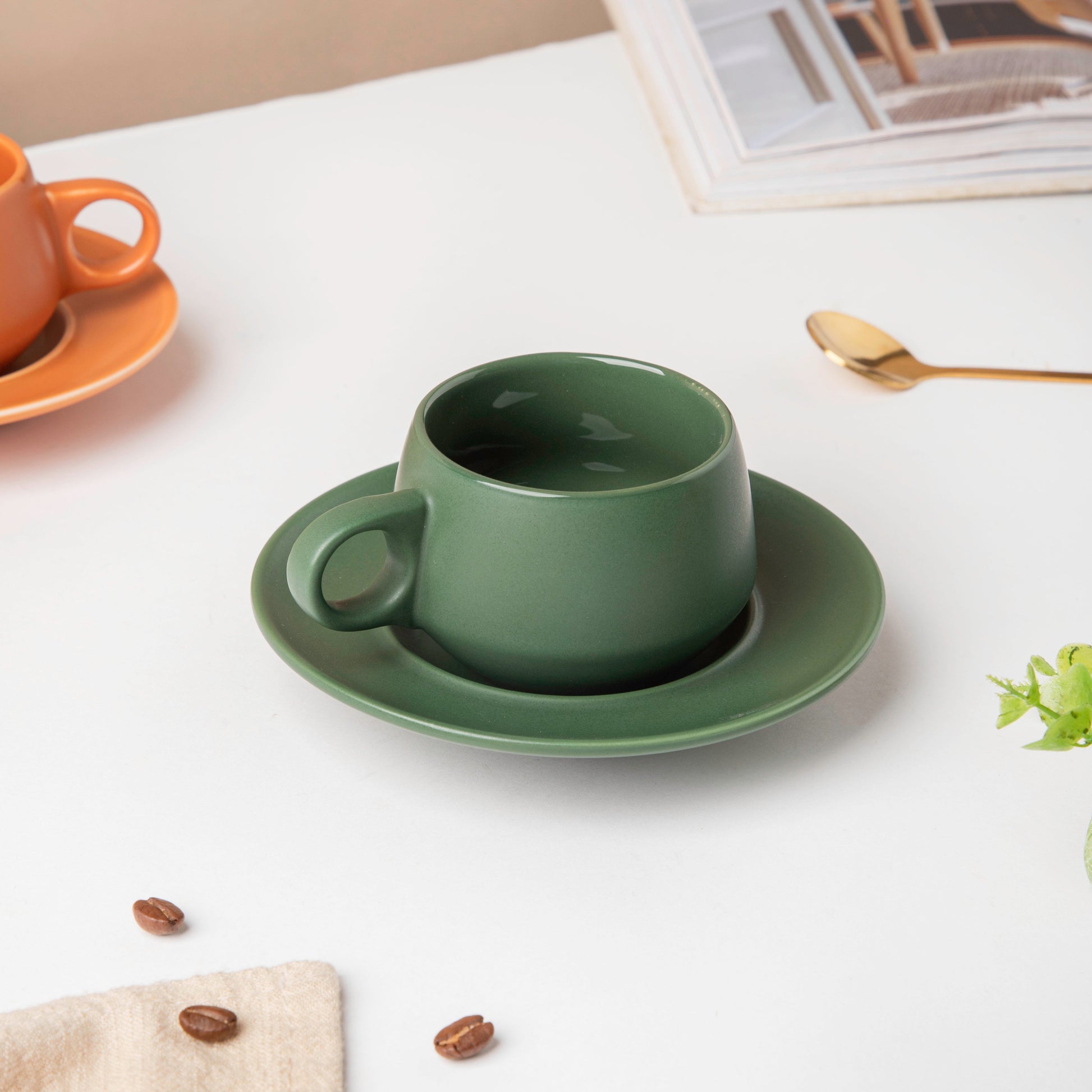 The green cup and saucer set comes with a matt-finish appeal which makes it suitable for all occasions. Offer warm coffee, tea, or flavored drinks in the coffee mug for a heartfelt serving to the guests. The saucer comes with a groove to hold the cup in place.