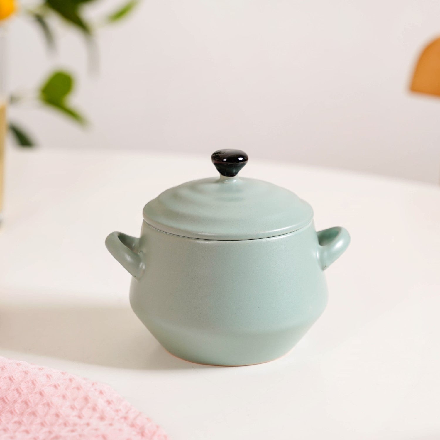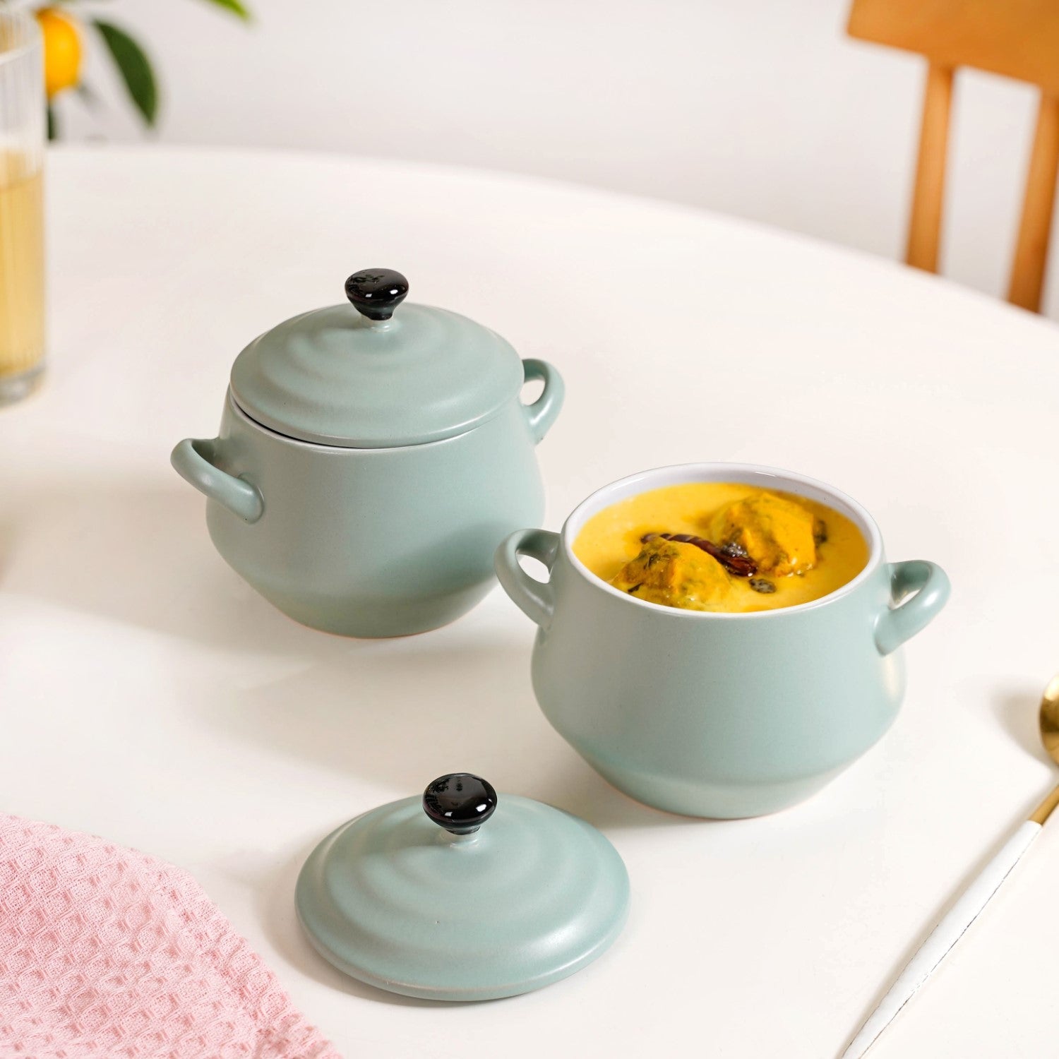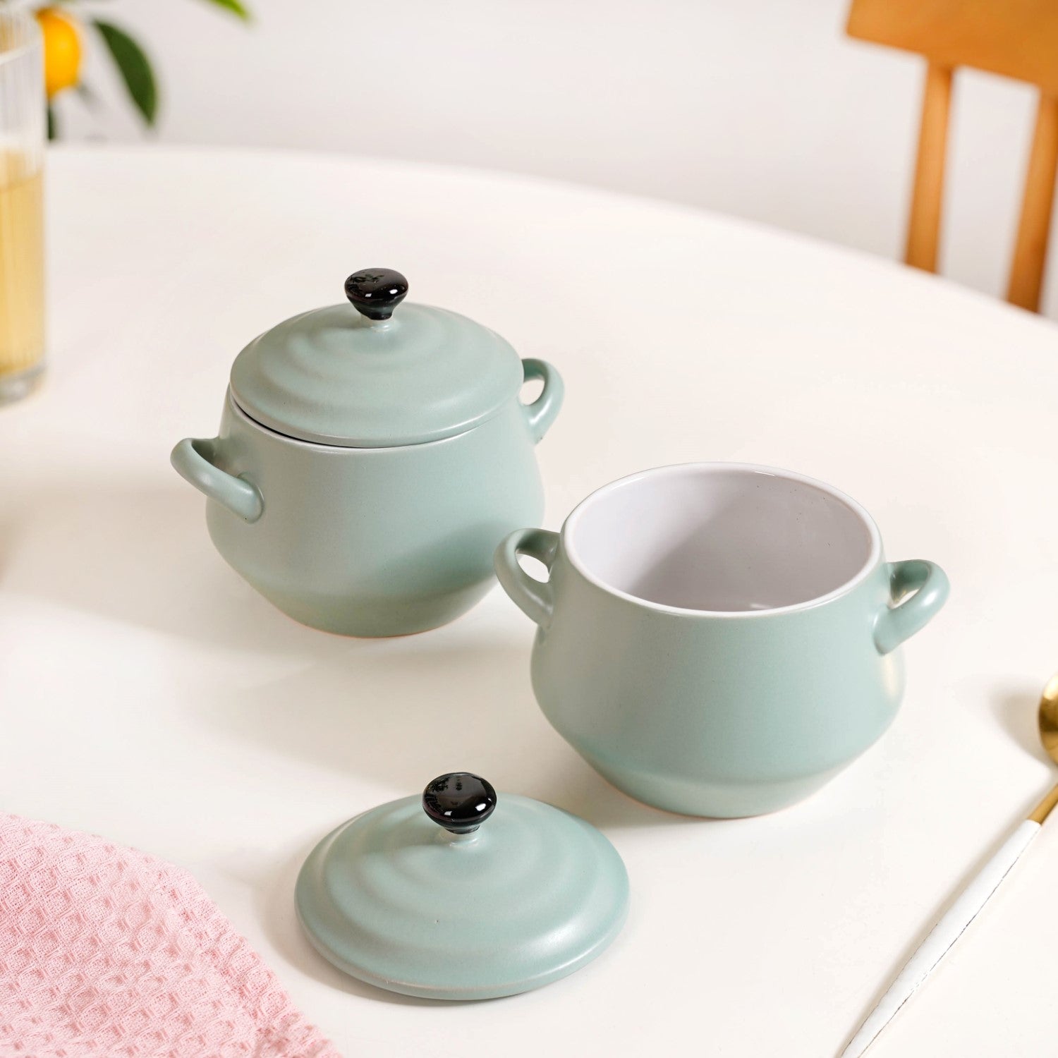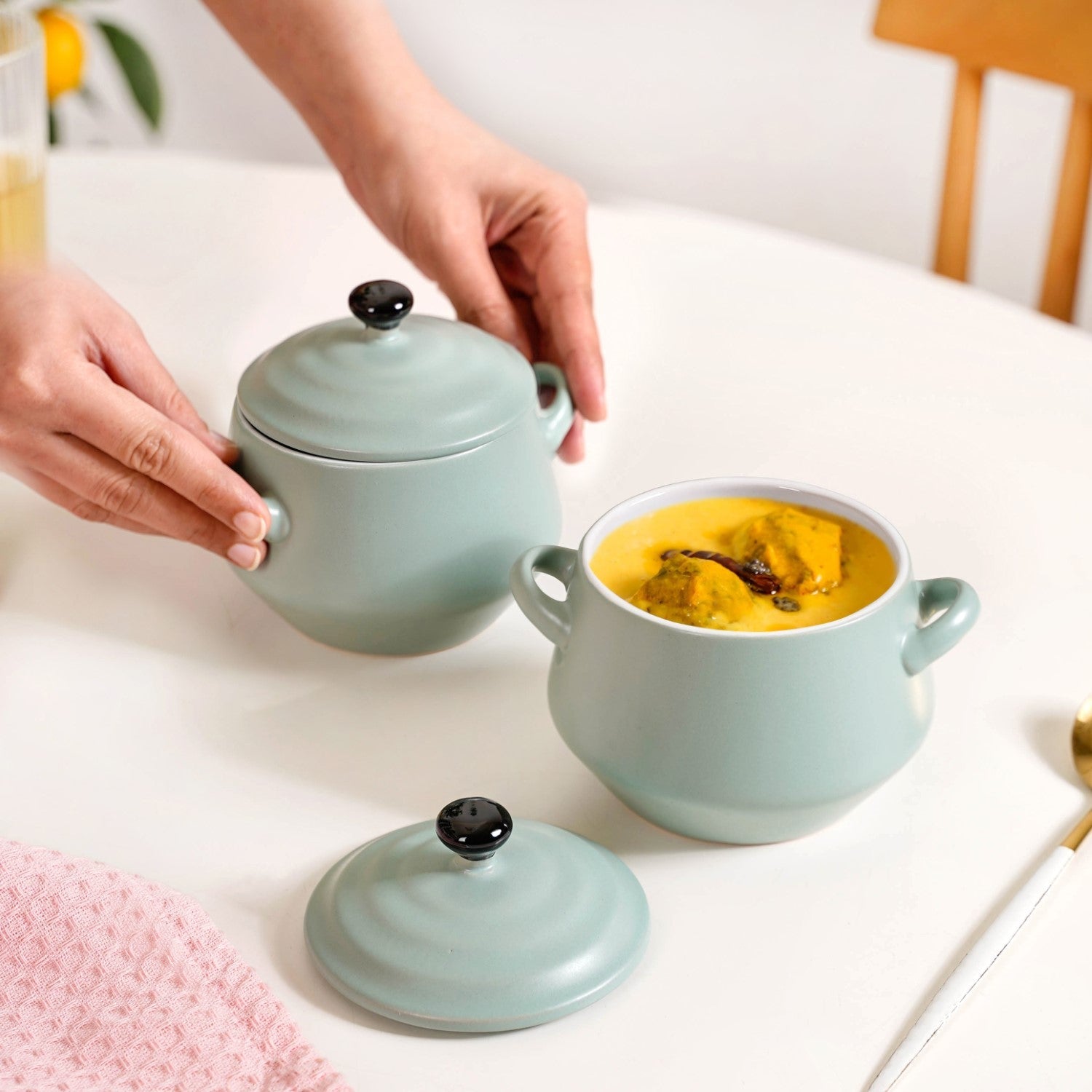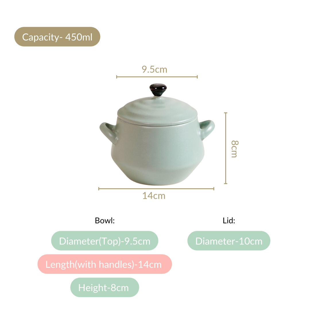 Design: With a soft matte finish, these handcrafted ceramic soup bowls radiate a serene sage green hue that complements any table setting. Each pot-like shape soup bowl features two easy-to-hold handles for effortless serving, and the snug lids ensure your soups stay warm and delicious, creating a cosy atmosphere with every meal.