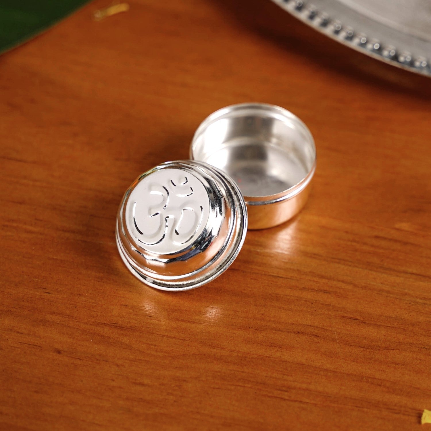Design: Crafted with devotion and elegance, this round puja thali set is made from pure stainless steel and features a high-gloss polished finish, providing a sturdy and radiant base for your daily spiritual practices. Thoughtfully arranged on the thali are five essential components, each handcrafted from brass and coated in silver, offering a blend of traditional charm and lasting durability. The set includes a silver-toned ghanti with a textured handle that produces a clear, resonant sound during prayers. A domed camphor or sindoor box, embossed with a sacred ‘Om’ symbol, offers secure storage for ritual powders. The flower-shaped agarbatti holder features five slots, allowing multiple incense sticks to be placed at once and filling the space with a divine aroma. The diya holder, with its graceful leaf-textured spout, is ideal for ghee or oil-based lighting. Completing the arrangement is a prashaad bowl, perfectly sized for offerings of sweets or dry fruits.