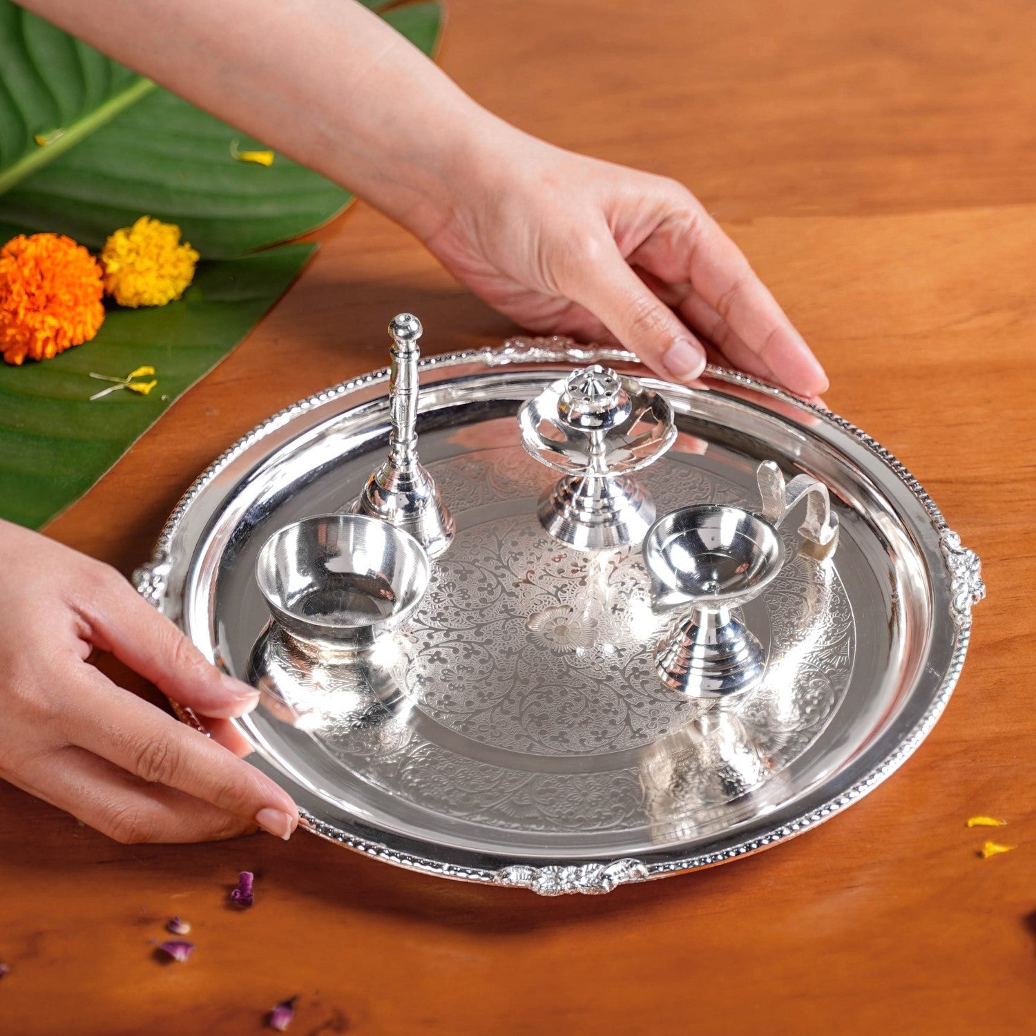 Nestip: Keep the thali set pre-arranged on your pooja shelf for seamless daily rituals.