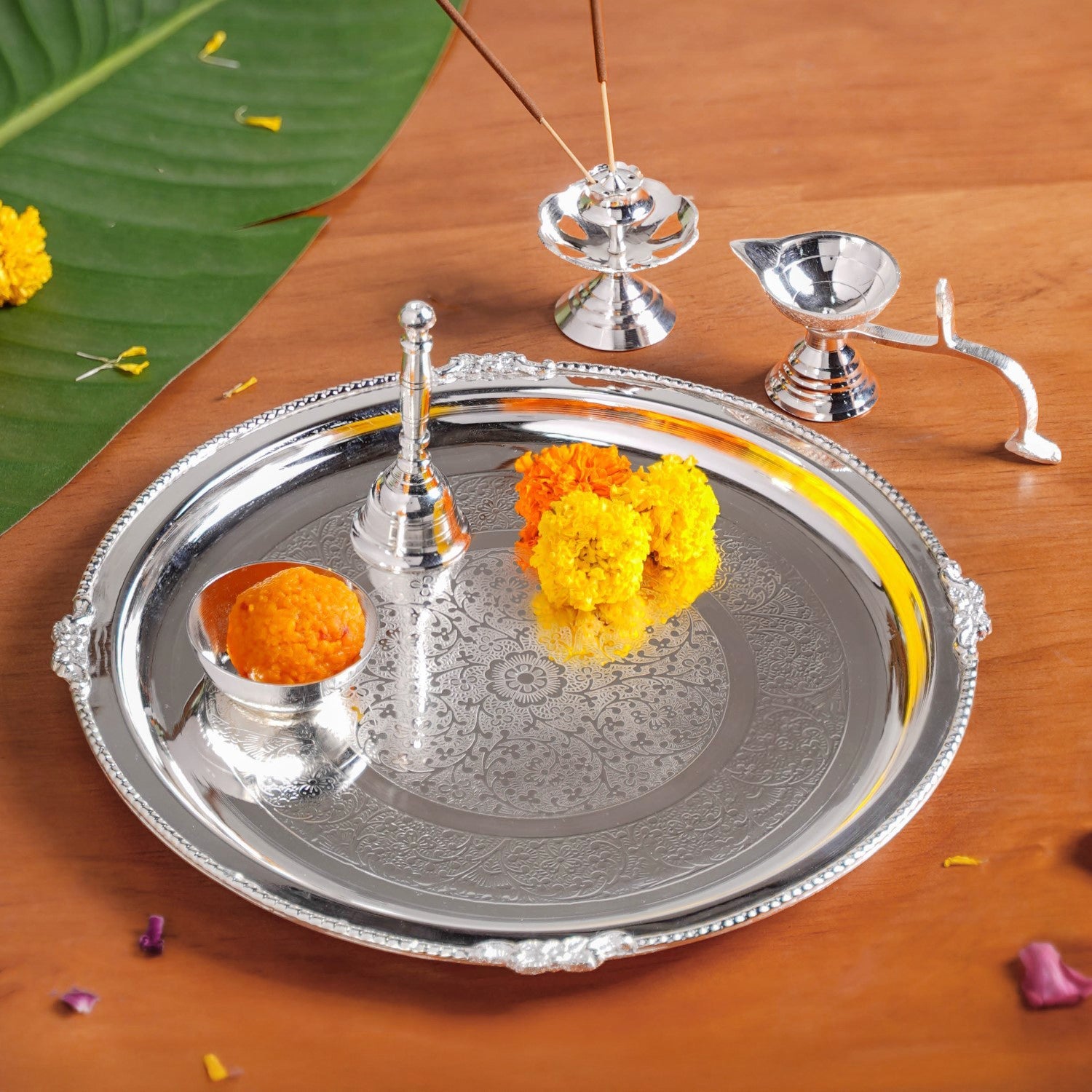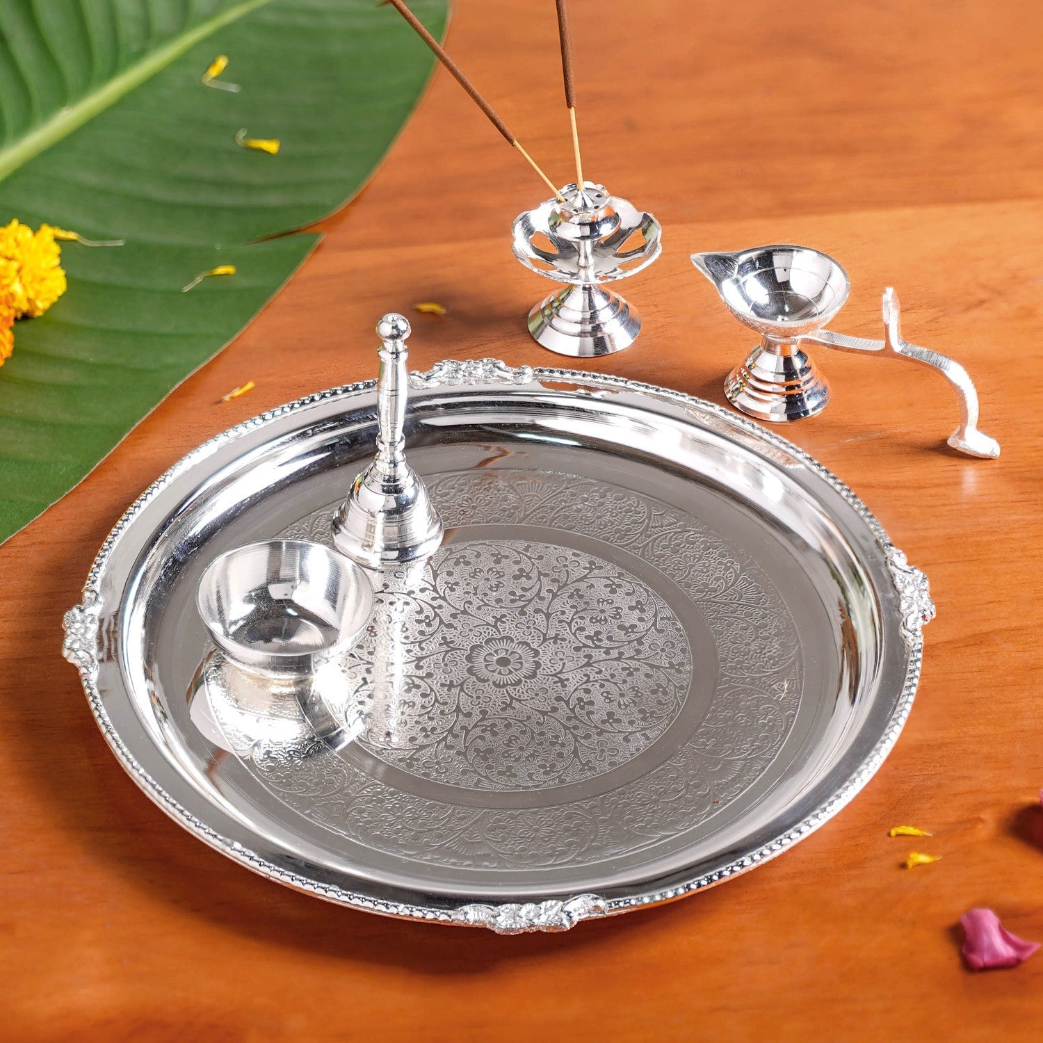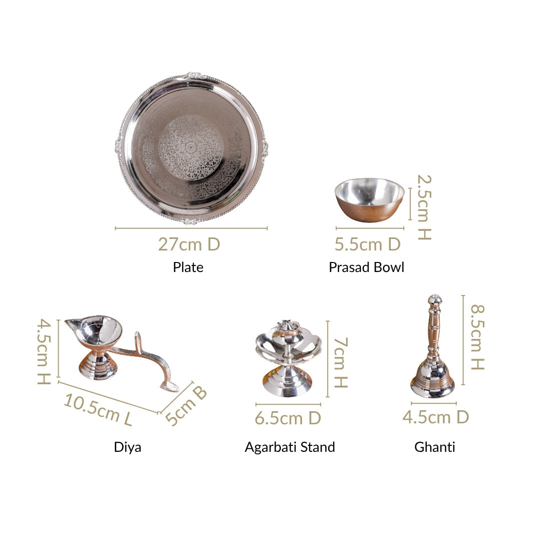 Benefits: This thali set’s heat-resistant design keeps lit diyas safe without warping or overheating. The stainless steel surface resists stains from chandan, sindoor, and haldi, making cleaning easy. Silver-coated brass components prevent rust and maintain their shine over time. A stable, flat base keeps all offerings secure during rituals, while the compact, lightweight design makes the set easy to carry and use anywhere. With separate, dedicated accessories, setting up and cleaning after pooja is quick, hygienic, and hassle-free.