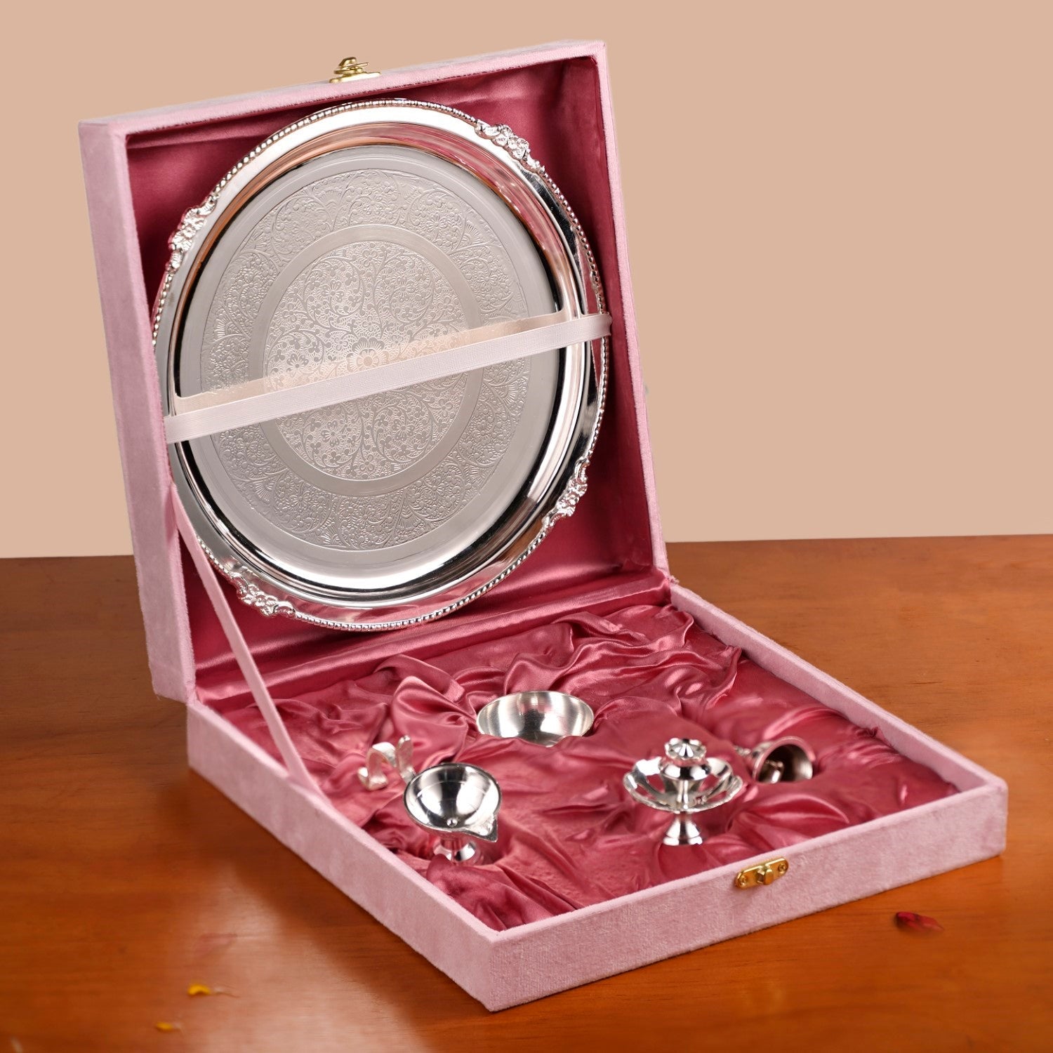 Design: The thali features a ribbed rim with four embossed floral accents, symbolising the four directions of sankalp. At its centre, a mandala-inspired design adds a sense of balance and spiritual depth to the setup. The diya stand is thoughtfully shaped with an elongated tail and curved finger rests, allowing for steady grip and control during ritual flame lighting. The diya, agarbatti stand, and ghanti are all crafted from brass with a silver coating, lending them a radiant, polished finish. With five evenly spaced slots and a solid base, the agarbatti stand ensures stable placement during pooja. The prasad bowl is smooth and rounded with a deep base, perfectly suited to hold sweets, dry fruits, or prasadam. Each element is designed to fulfil a distinct purpose, creating a harmonious and intentional flow for every step of the ritual. For added convenience and elegance, the full set is presented in a plush velvet gift box, ideal for both premium gifting and safe, organised storage.