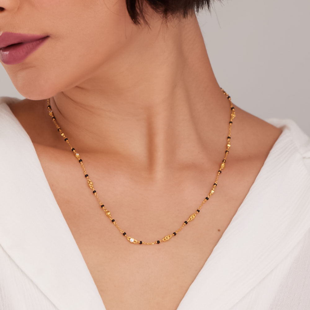 Embodying the eternal bond of love and marriage, this mangalsutra embraces cultural traditions and flaunts a contemporary design. Meticulously crafted with 18K gold, it gracefully flows around your neck, affirming the beauty of your marital bond. This design is a whispered affirmation of heritage and timeless elegance.
