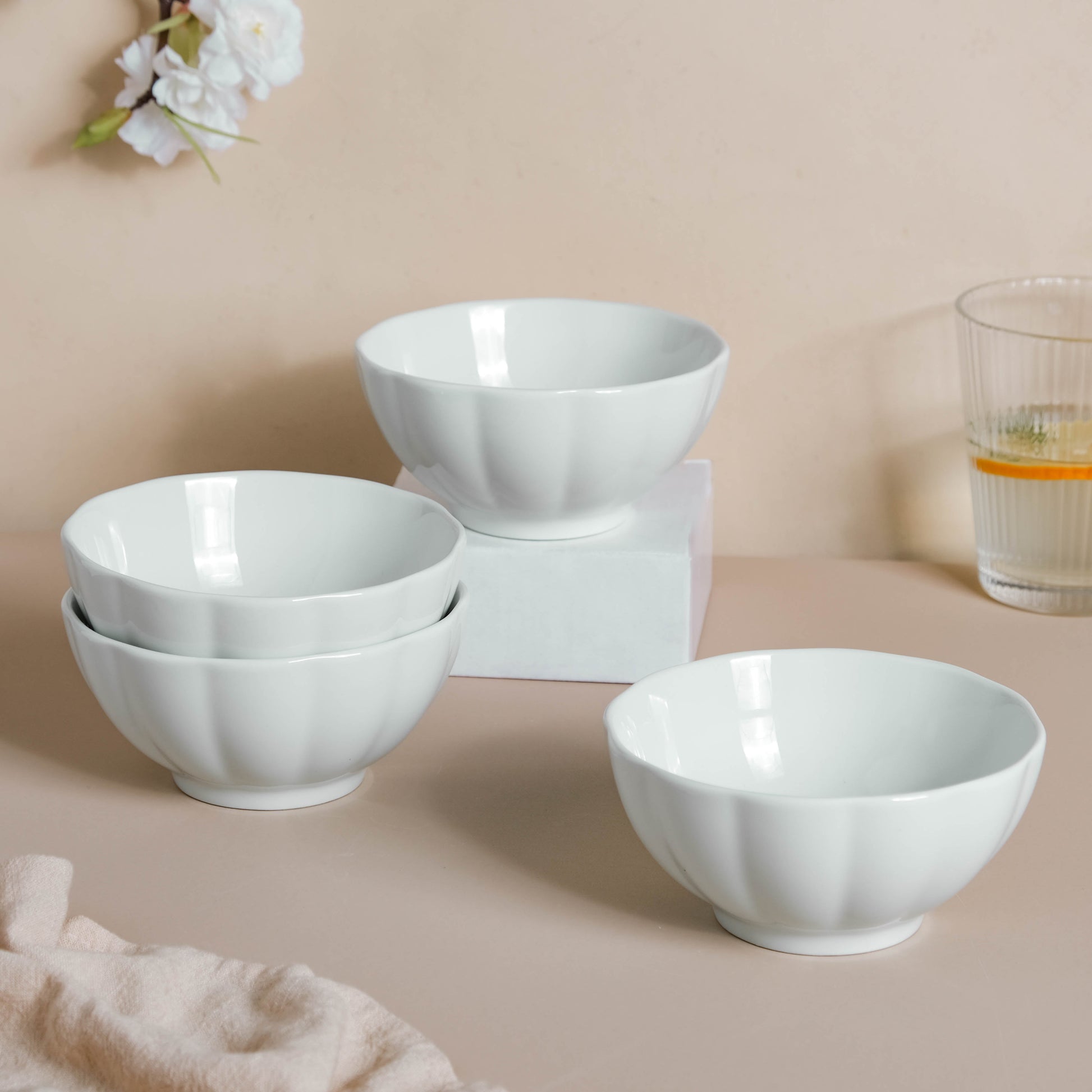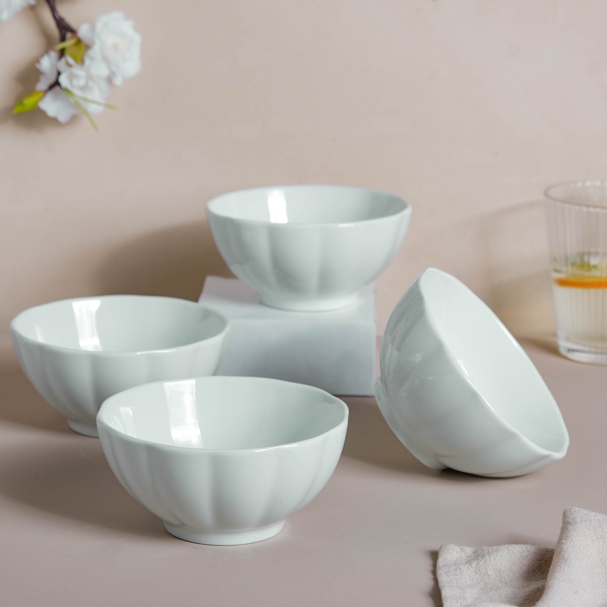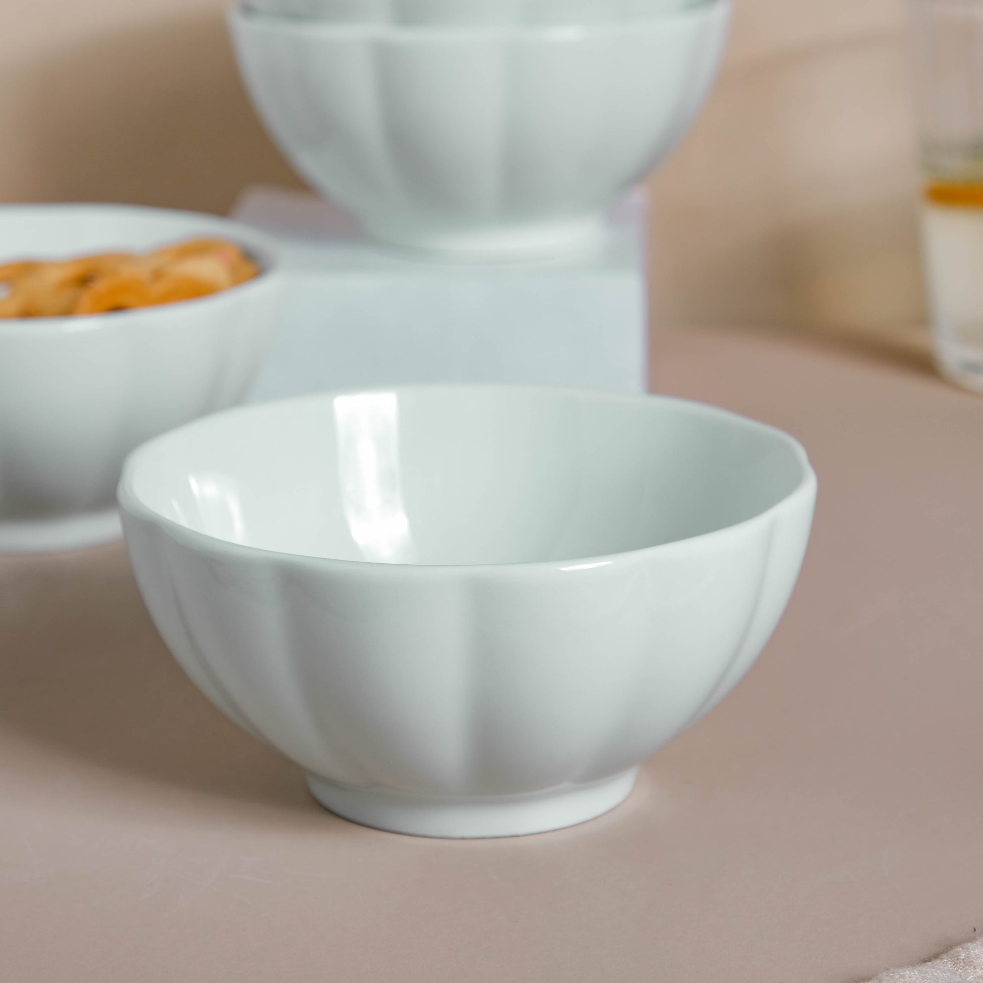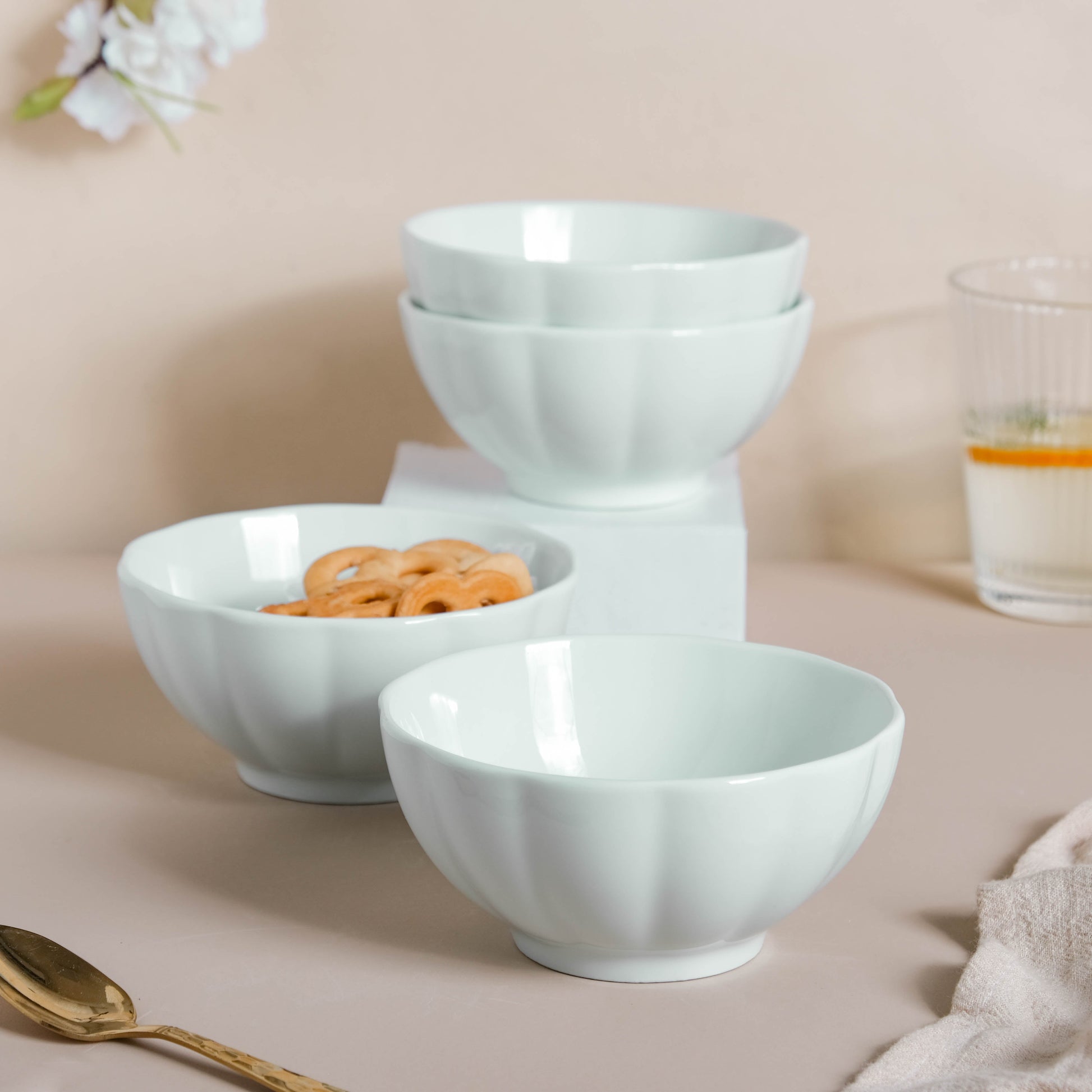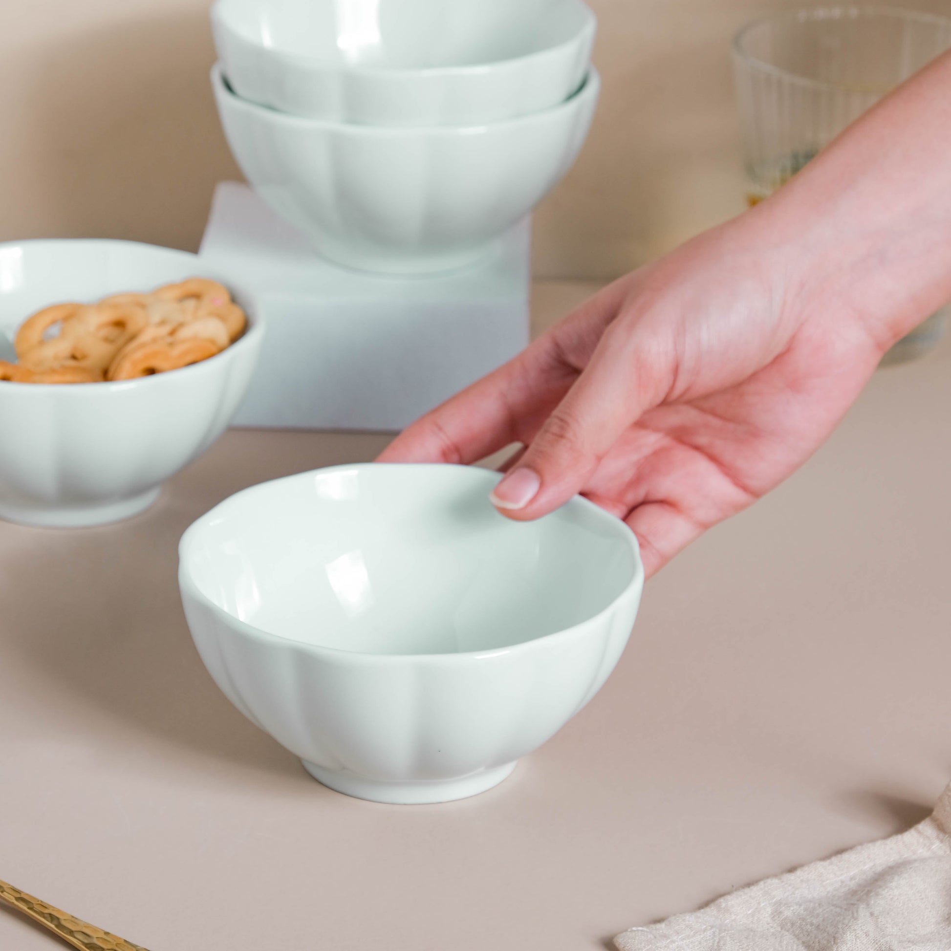Sleekly designed with the signature glaze of fine ceramic, the mint-hued bowl set of 4 with a scalloped texture, is pristine and robust, making it a timeless addition to any tea-time crockery collection. The set is an easy choice when it comes to serving snacks to guests during high tea or as side dish bowls.