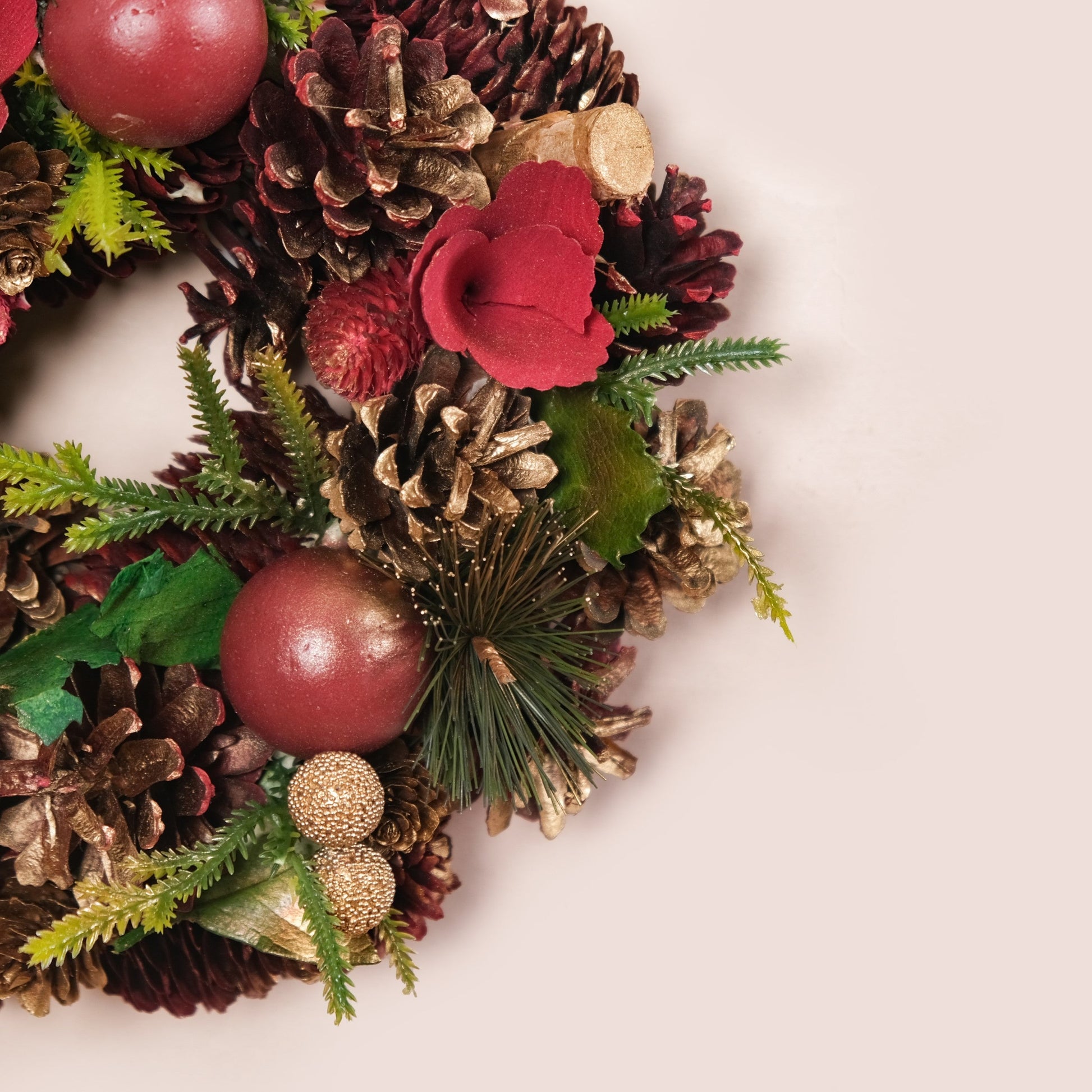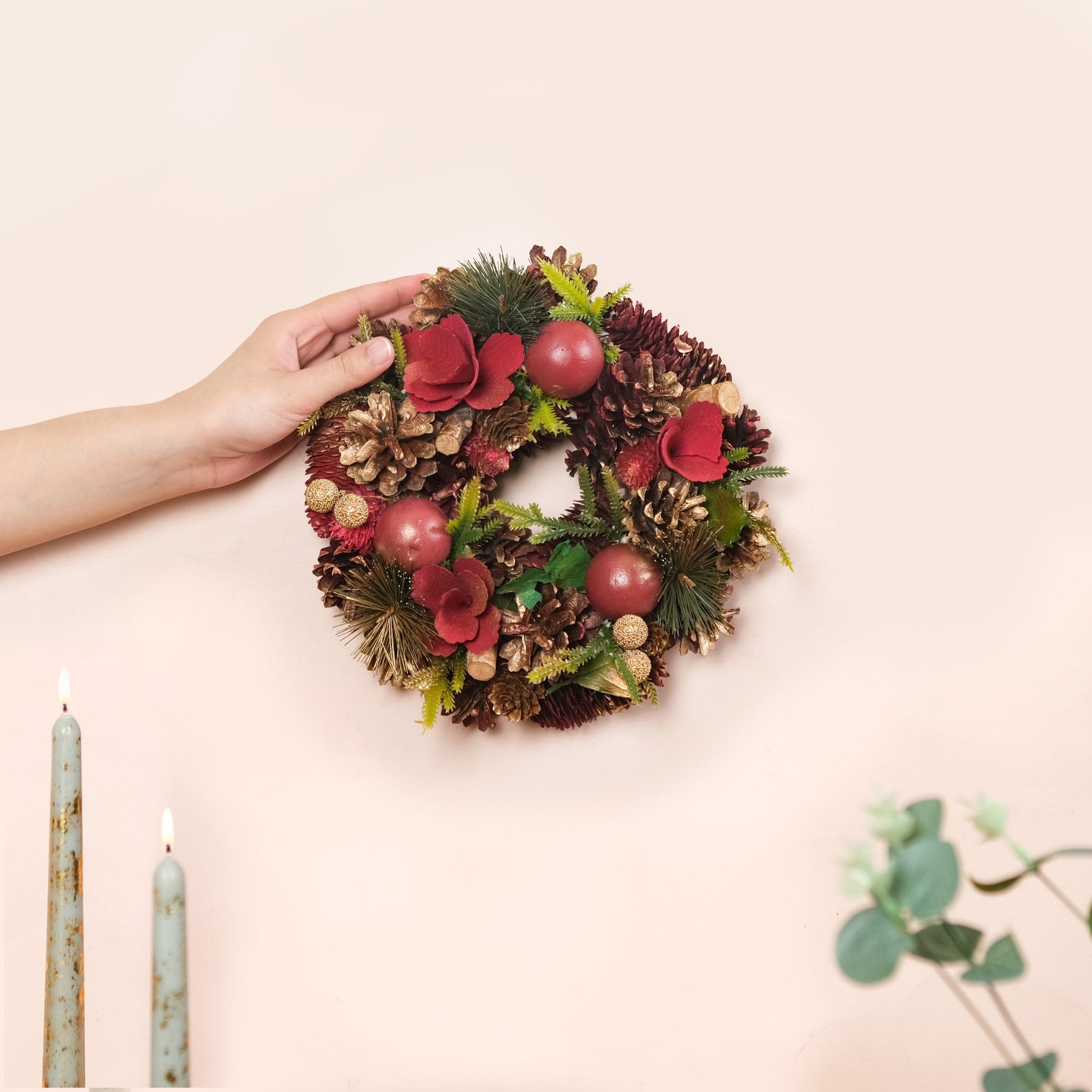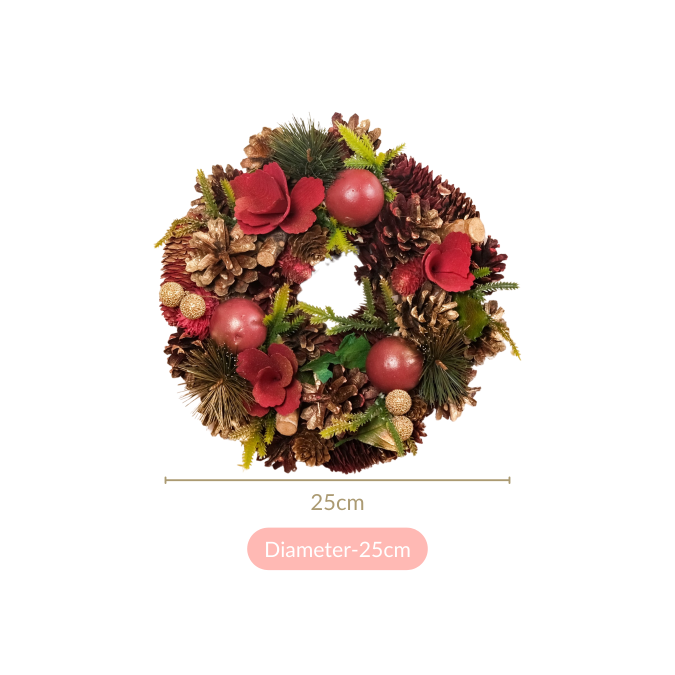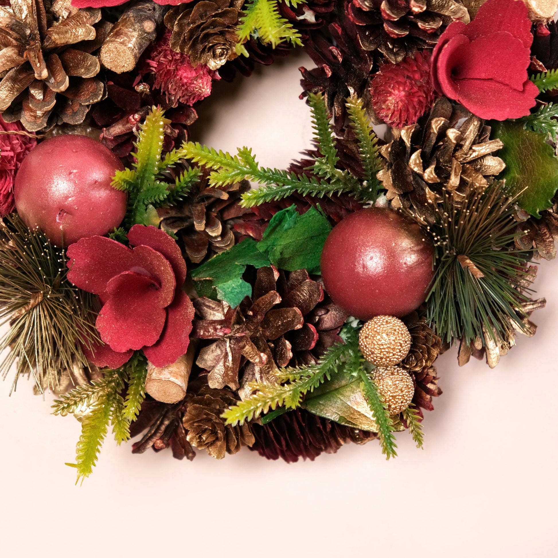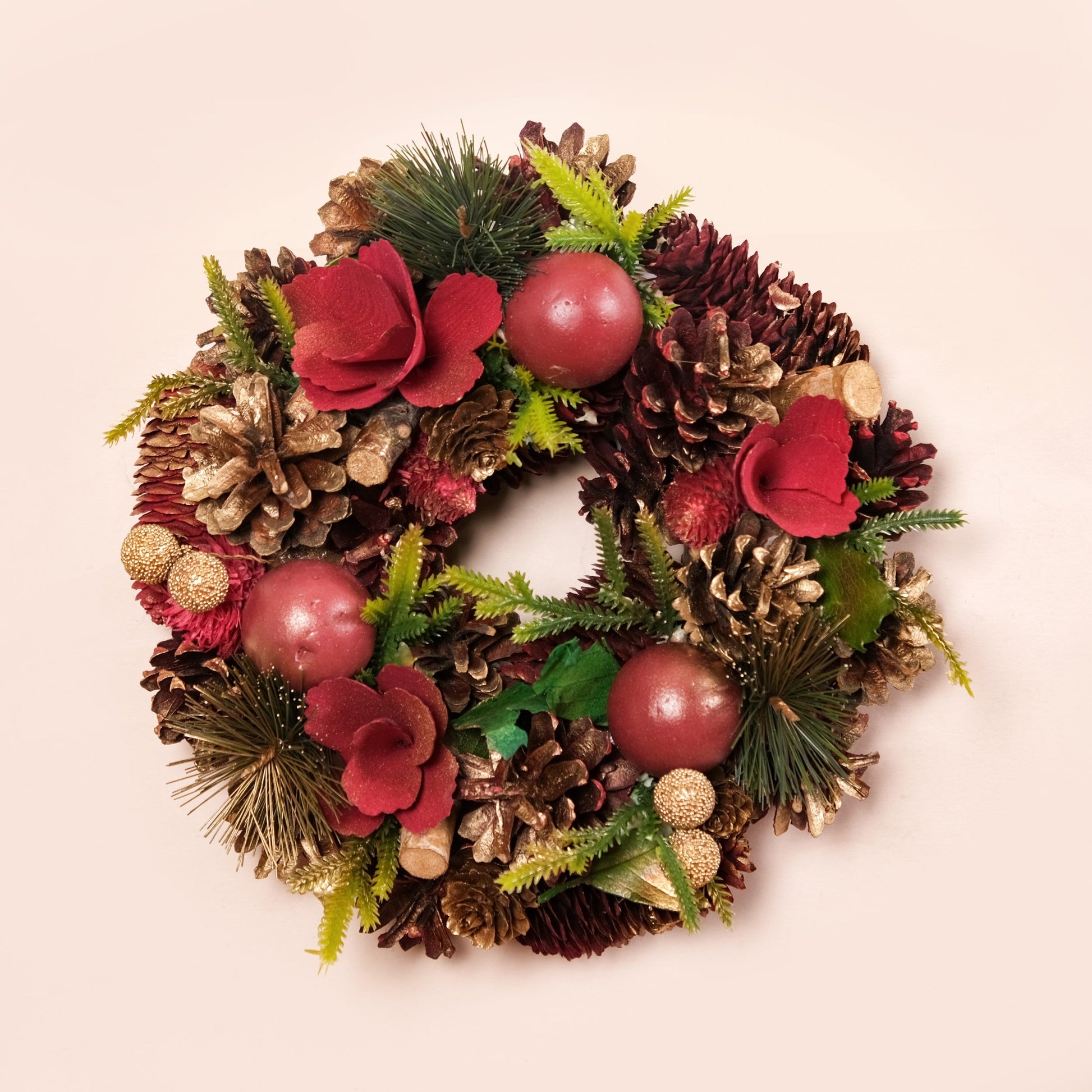 Design: This Christmas wreath is artfully arranged with dried pine cones painted in rich shades of gold and red, paired with vibrant faux green leaves and golden berries for a lush, layered look. Red decorative balls and wooden flowers add playful colour, while intricate wooden blocks in gold provide a rustic touch. The mix of textures and festive hues make this wreath an eye-catching accent for any door or wall decor.