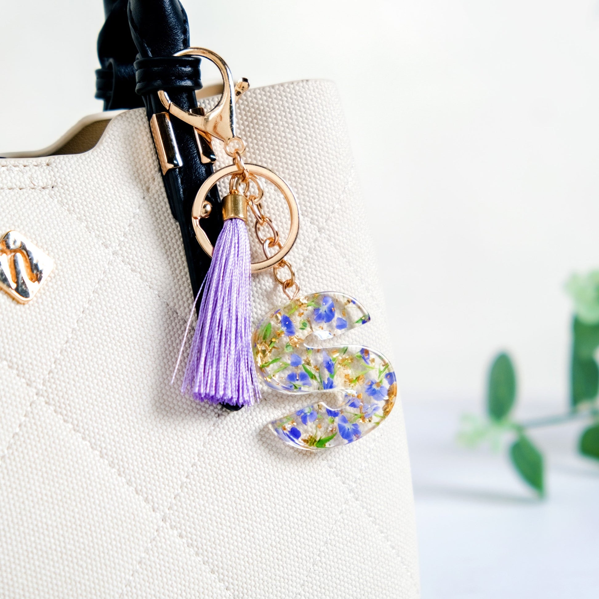 Take your style game to the next level with the adorable resin keychain featuring the letter "S." The keyring features a sleek transparent resin case with pressed lavender forget-me-not flowers and shimmering golden flecks, radiating charm and sophistication.