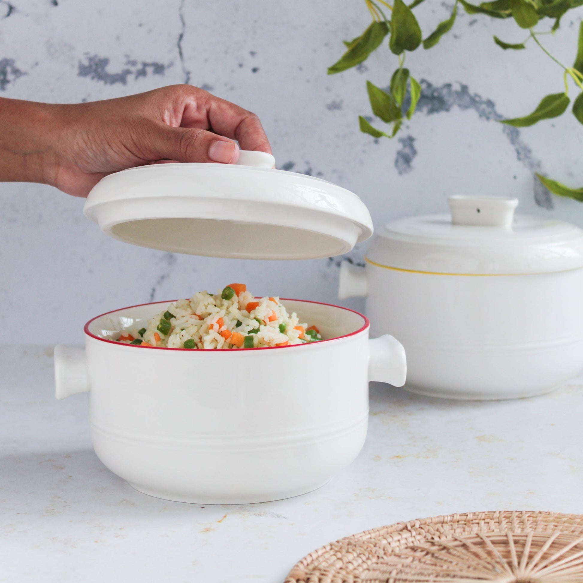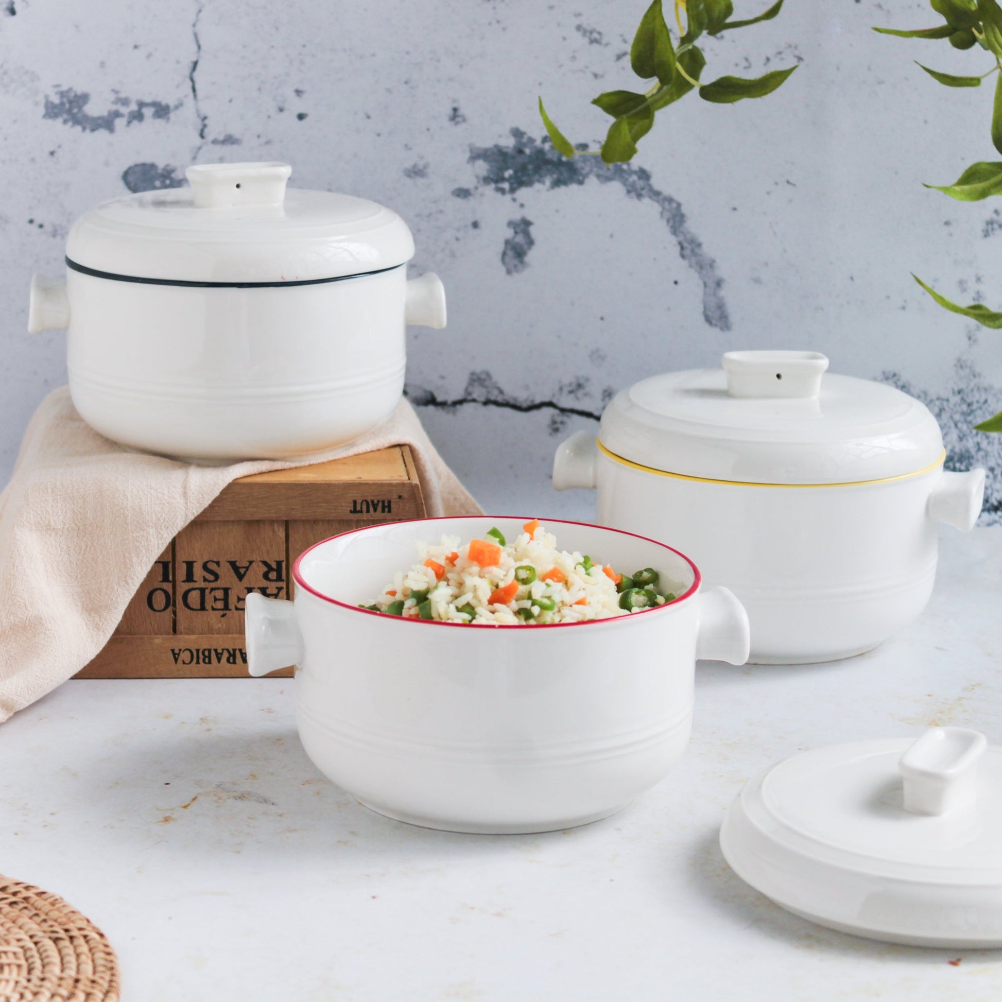 Serving Pot with lid and with handles in a timeless white shade is available in 3 variations, pertaining to the color of the lining of the lip. The bowl with lid and handles can also be used in the kitchen to store spices and condiments. Serve 2-3 portions of soup, gravy, lentils, one pot recipes for an individual serving in the pots with handles. The handle of the bowls make them easy to pick, place, and pass around a dining table while the lid keeps the soup and dishes warm and intact.
