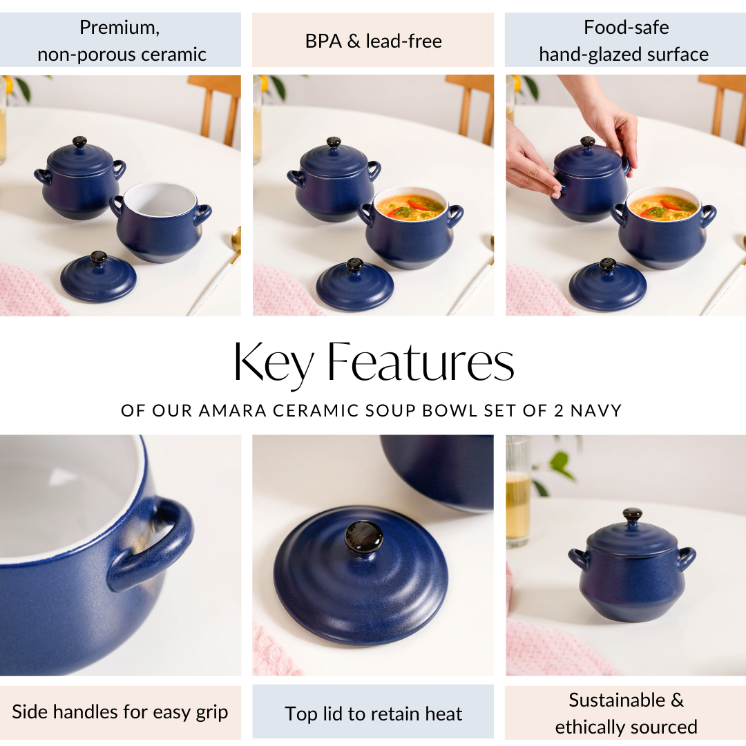 This set of 2 ceramic soup bowls is perfect for enjoying your favorite soups! With a sleek, navy blue finish and handy lids, these ceramic soup bowls with lids make every meal feel special.
