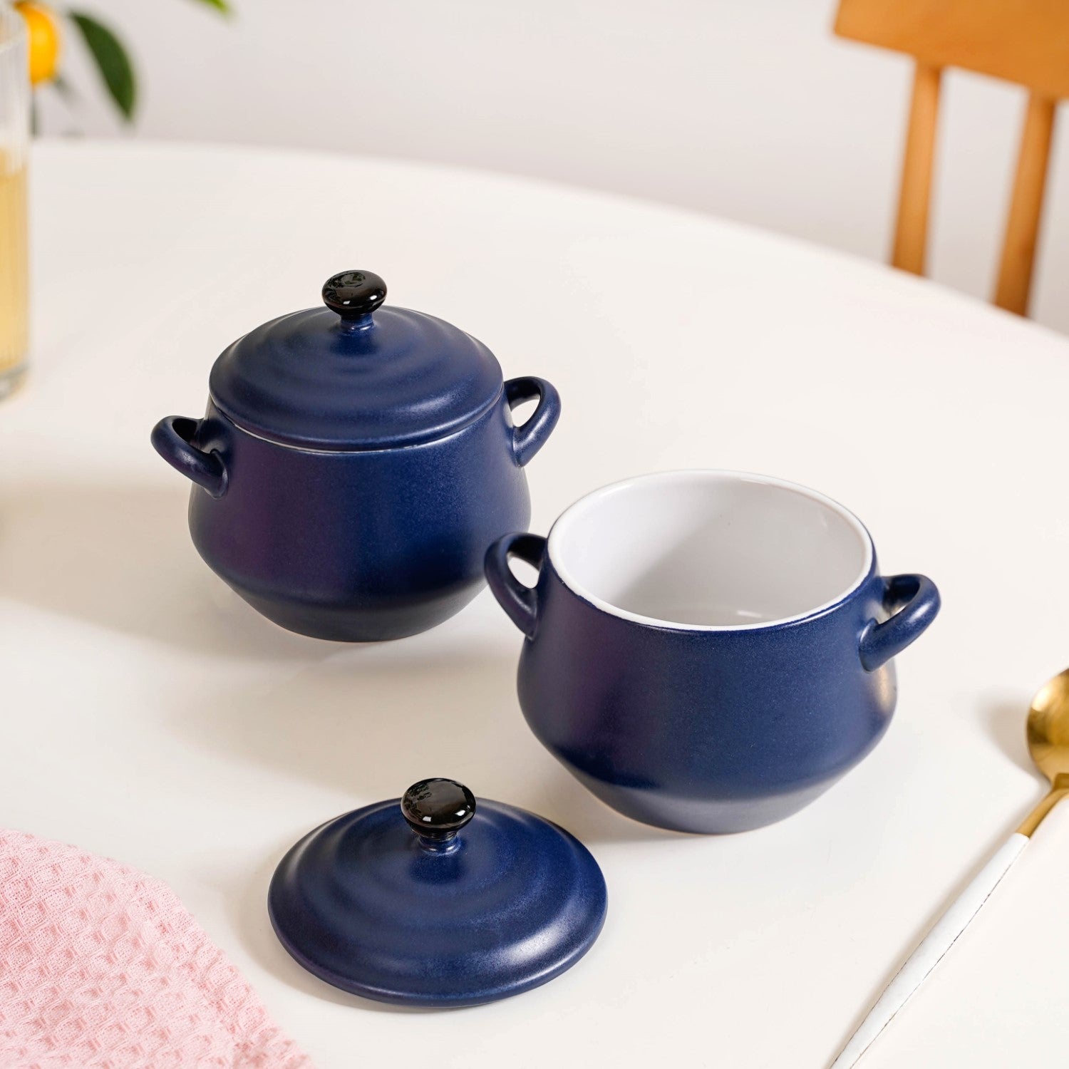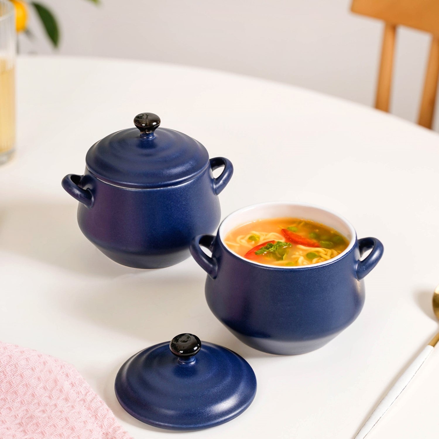 Design: These navy blue ceramic soup bowls are all about simplicity with style. The matte finish gives them a soft, modern look, while the pot-like shape, complete with two handy side handles, makes it super easy to carry them straight from kitchen to table. Furthermore, each soup bowl comes with a snug lid to lock in the heat, ensuring that your soup stays warm and full of flavour until the very last spoonful.