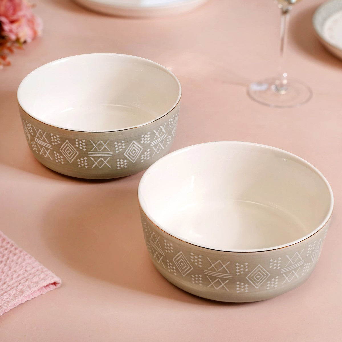 Step up your dining game with Azo Collection's grey serving bowl set - a dynamic duo designed to elevate your table setting! Crafted from 100% food-safe ceramic, these serving bowls adhere to international standards for safety. Lead-free and non-toxic, they ensure your meals are served with utmost care. Adorned with metallic gold-detailed rims and intricate Aztec patterns, they exude an air of sophistication. The light grey and white colour combination adds a contemporary flair to any occasion. Perfect for both formal dinners and casual gatherings, these large bowls are a must-have for every stylish host. Elevate your dining experience with the Azo grey ceramic serving bowls - where elegance meets practicality.