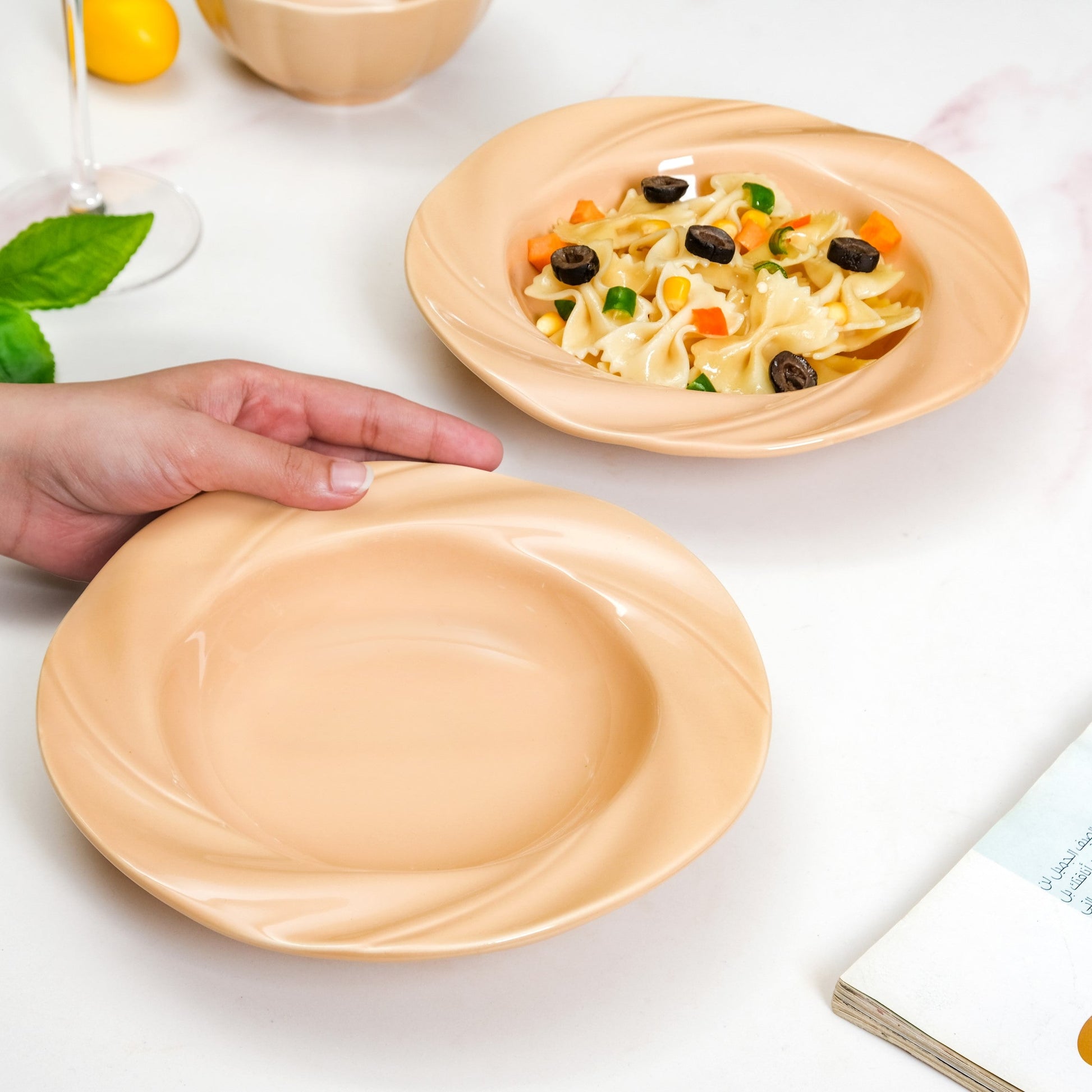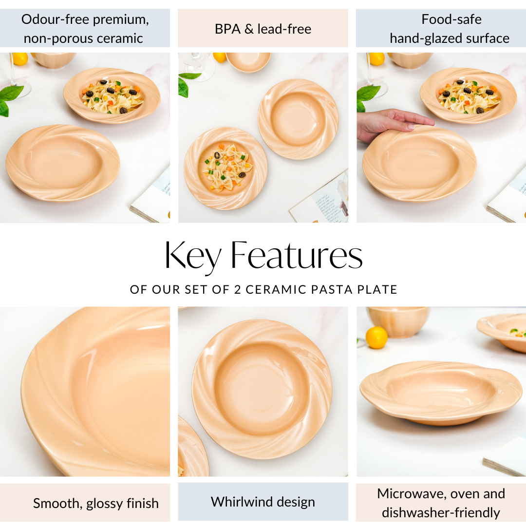 Benefits: Crafted meticulously from premium-quality ceramic, these pasta plates are not only elegant but also extremely durable. Having been fired at high temperatures, the surface of the ceramic is smooth, non-porous, and resistant to absorbing moisture, lingering odours, and stains. Adhering to stringent standards of food safety, the plates are also 100% lead and BPA-free. Their microwave-safe construction makes reheating leftovers a breeze, while the dishwasher-compatible feature facilitates convenient cleanup.