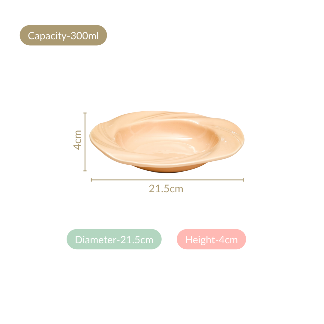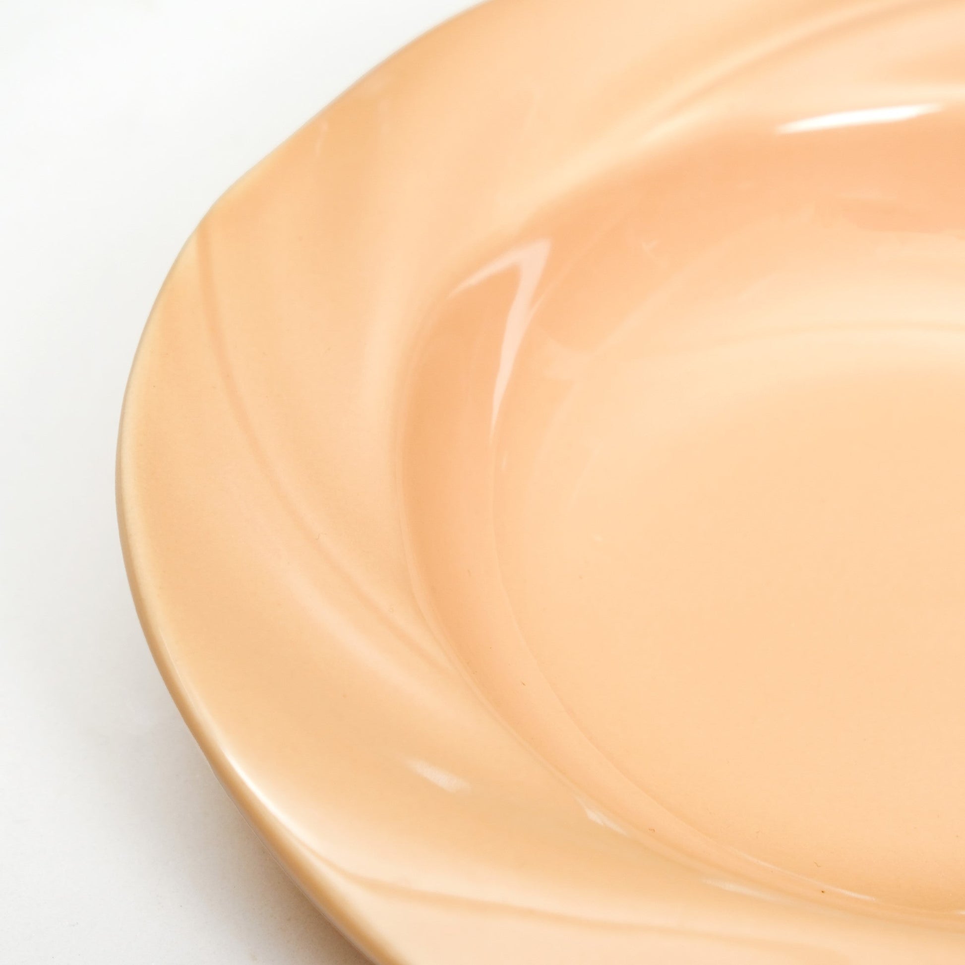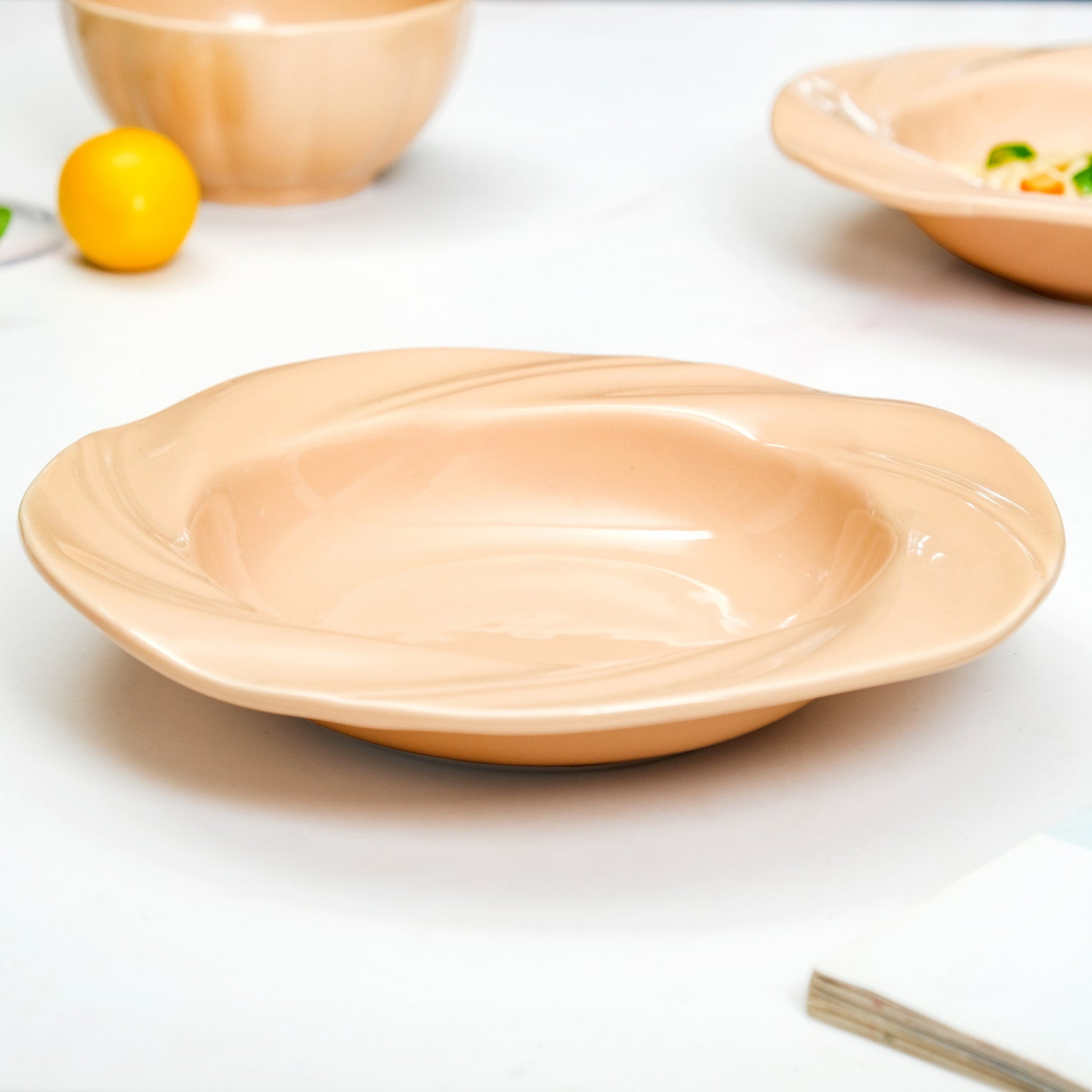 Design: Featured in a subtle Novelle peach shade, each ceramic plate flaunts an eye-catching whirlwind rim with ridges. Complemented by a smooth, glossy finish, the serving dishes seamlessly blend modern design and expert craftsmanship.
