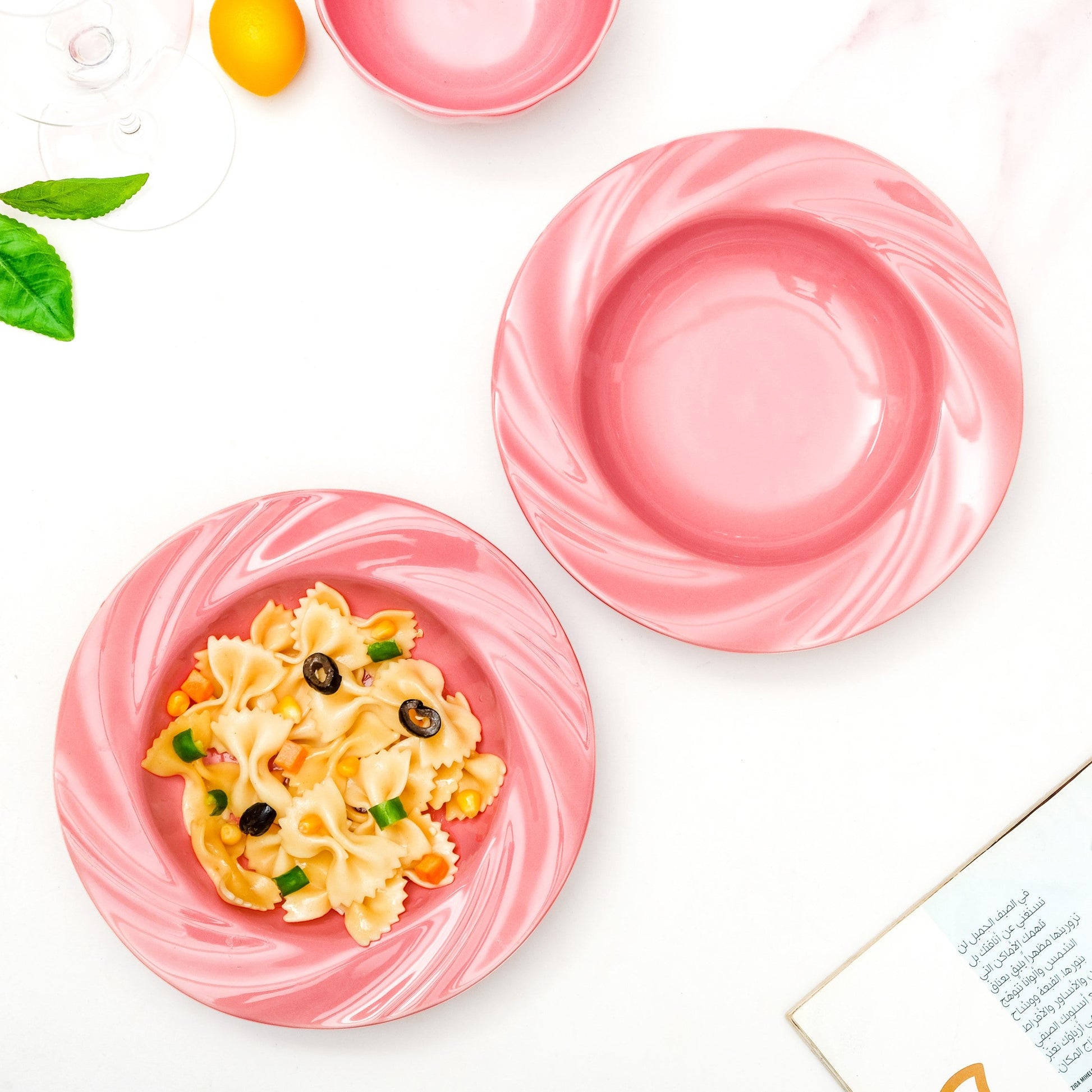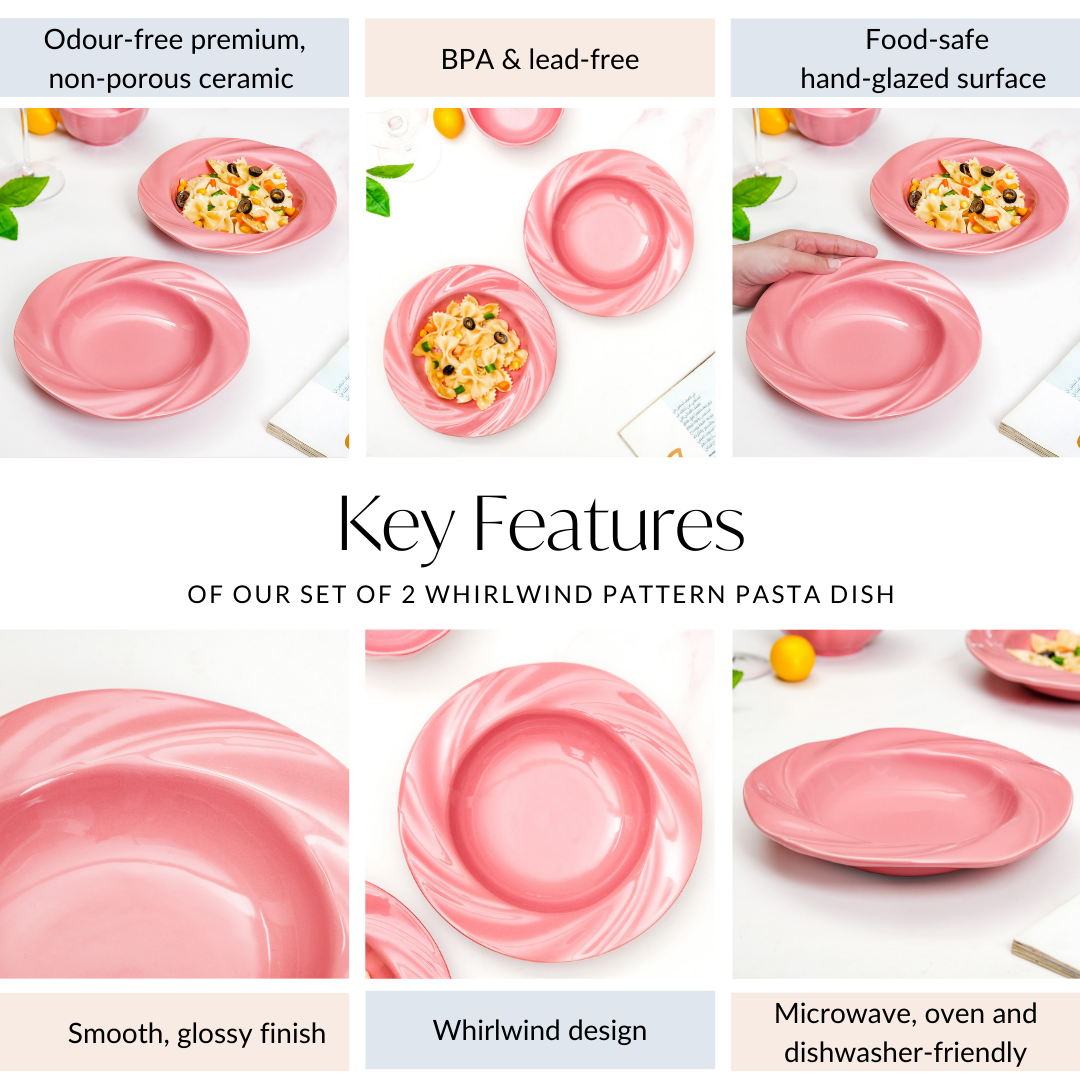 Design: Featured in a rosy blush pink shade, the serving dishes showcase flared rims with a captivating whirlwind design. Complemented by a glossy finish, the ceramic pasta plates offer enough depth for all pasta preparations.