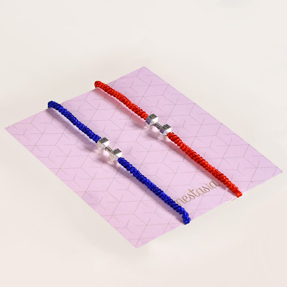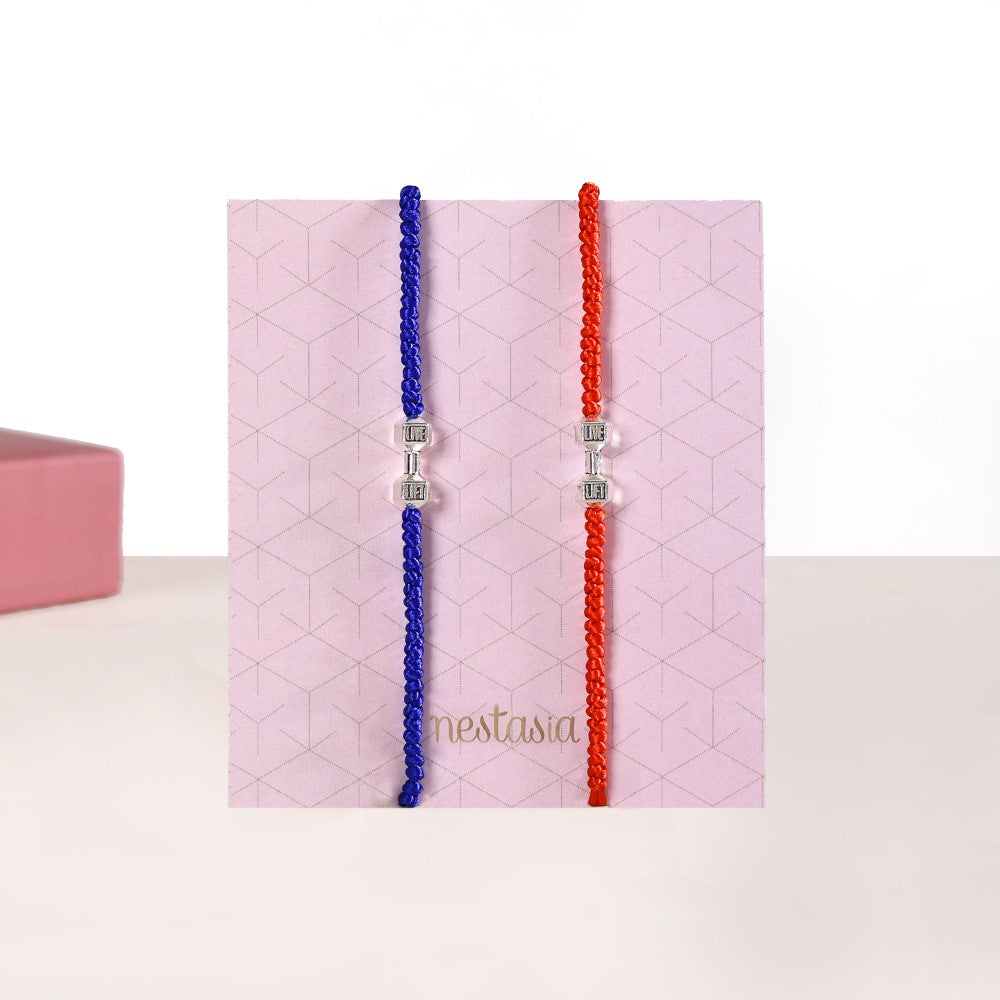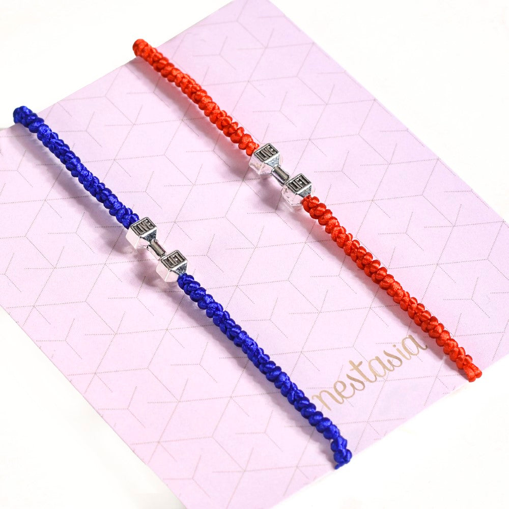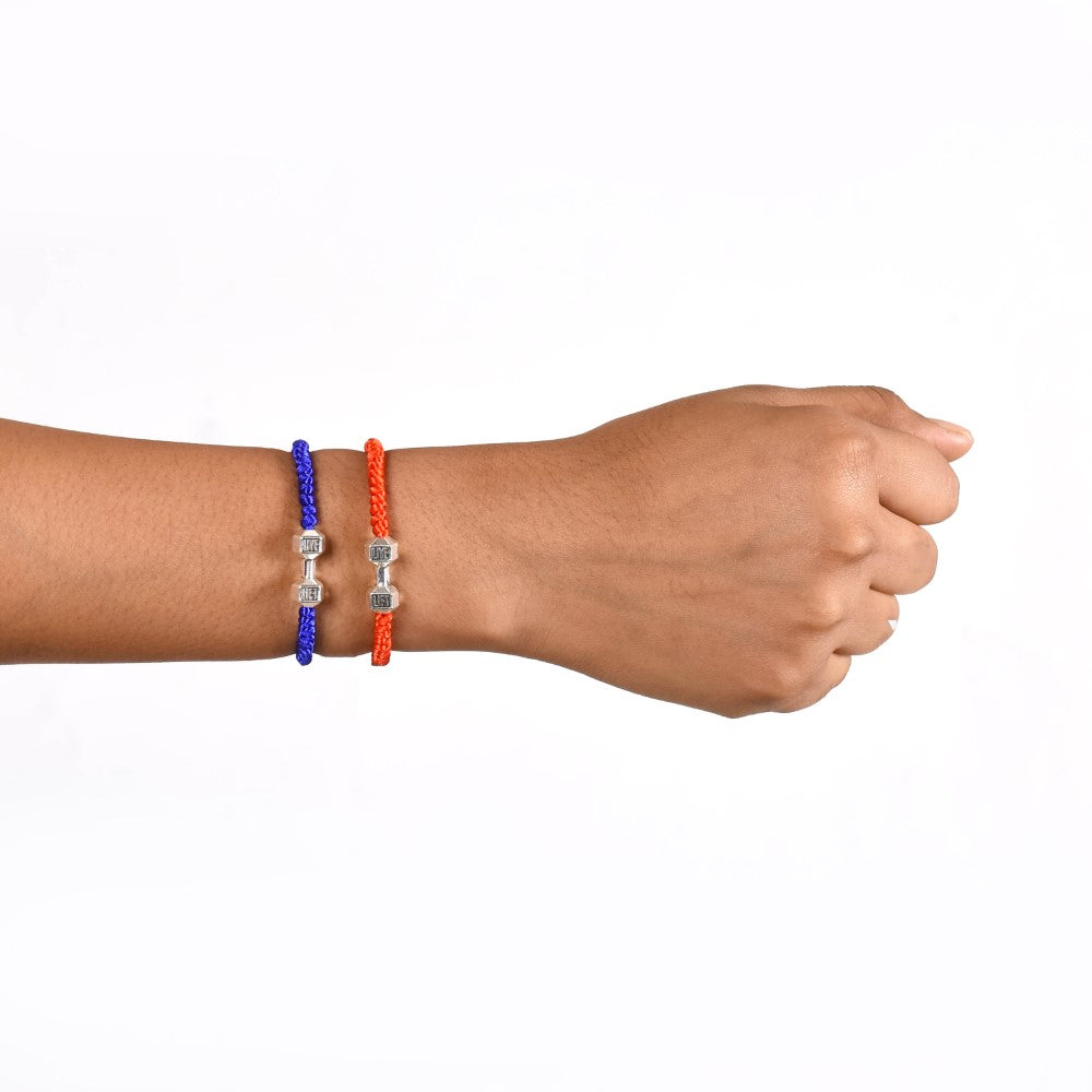 Show off your dedication to fitness with our set of 2 unisex bracelets. Whether you're looking for a fun and trendy accessory or love an active lifestyle, these bracelets make the perfect statement for all the gym freaks! Available in bold red and striking navy blue colours, each bracelet features a braided band and comes with a silver dumbbell charm that reads "LIVE" and "LIFT," encouraging your passion for staying fit and strong. Perfect for stacking or wearing solo, these tie-up bracelets are a must-snag accessory for all the workout warriors.