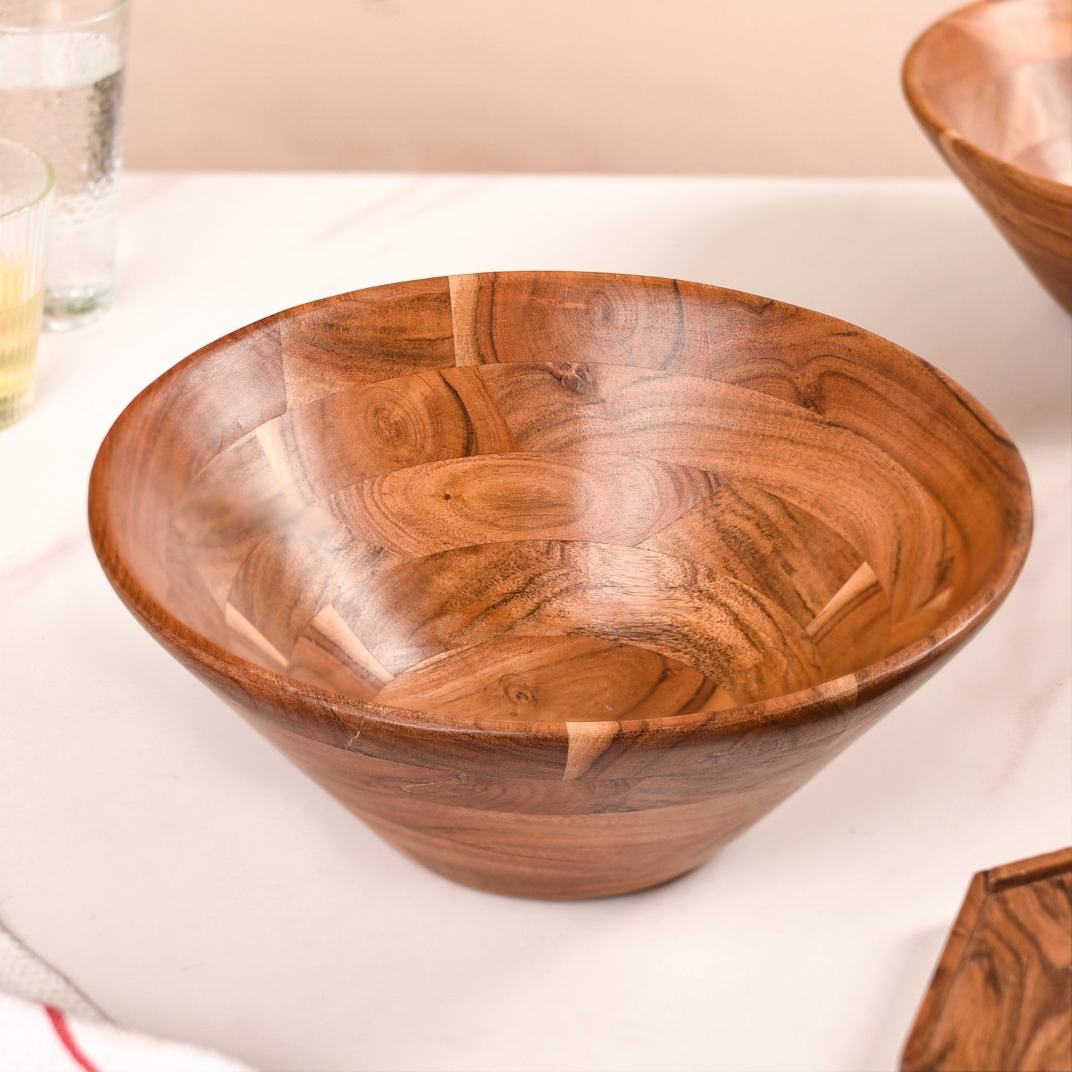 Design: Crafted from premium-quality natural acacia wood, the bowls come in a warm brown shade with swirled wooden grains and speckles flowing across their body. Complemented by the wood's natural lustre and engineered with a tapered shape that makes mixing salads a breeze, the wooden salad bowls add an elegant touch to any table setting.