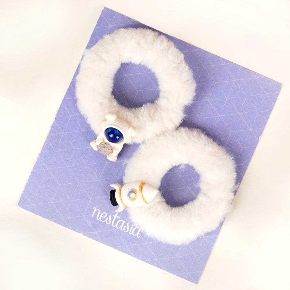 Adorn your wrist with our set of 2 plush bracelets - the perfect blend of style and cushiony comfort. Each bracelet features a seamlessly soft and plush band that feels gentle and fuzzy against the skin. One bracelet is complemented by an enchanting astronaut charm, star sequins studded inside his helmet, and an asteroid clutched in his hand. The other bracelet sports a cute rocket charm, reinforcing the celestial theme of the set. Whether gifted to the kiddos or worn by adults, these stretchy and adjustable bracelets are a great addition to your accessory collection.