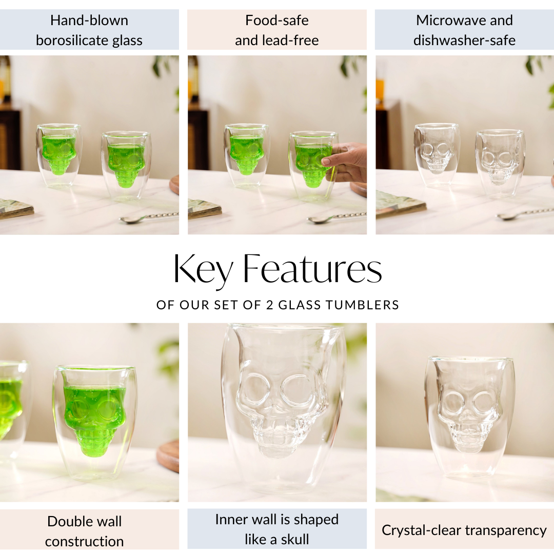 Design: Each drinking glass features a captivating skull-shaped inner wall, offering a striking, gothic visual effect. The double-wall construction of the glassware set enhances both aesthetics and functionality, while the crystal-clear transparency ensures you always have a clear view of your drink.