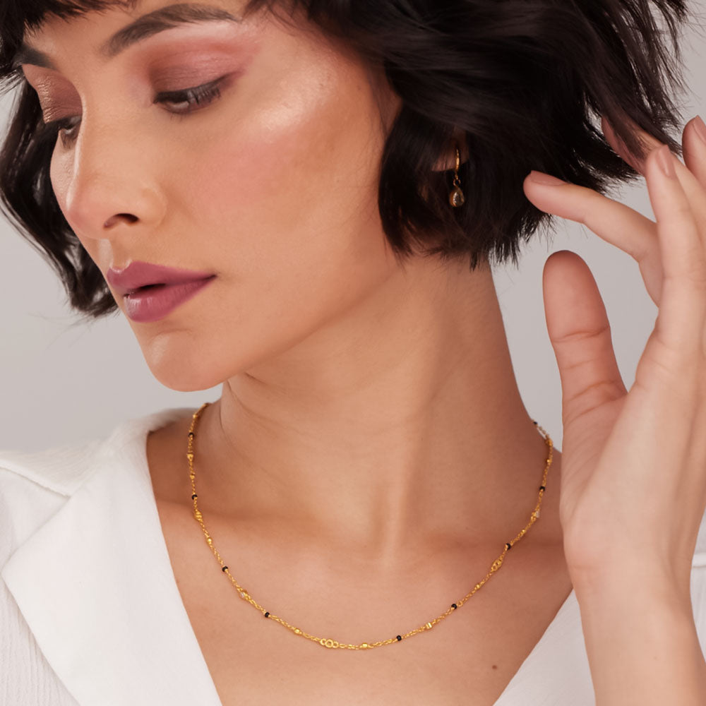 Embodying the eternal bond of love and marriage, this mangalsutra embraces cultural traditions and flaunts a contemporary design. Meticulously crafted with 18K gold, it gracefully flows around your neck, affirming the beauty of your marital bond. This design is a whispered affirmation of heritage and timeless elegance.