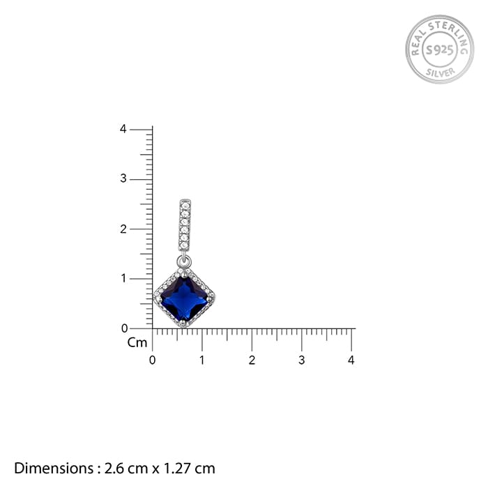 These silver earrings feature a rhombus design, with a blue-coloured stone at the centre and zircons studded around.