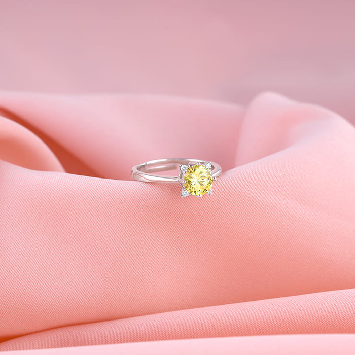 This silver ring features a single-stone amber coloured zircon, that is set inside a flower frame.
