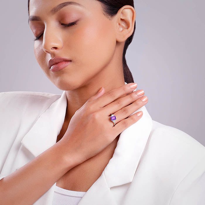 This silver women’s ring features a natural rectangular-shaped amethyst stone, flanked on either side by a cluster of smaller zircons. From nature’s heart to yours - Trendy Freak's natural Gemstone Collection makes every occasion special, whether you’re gifting a loved one or treating yourself.