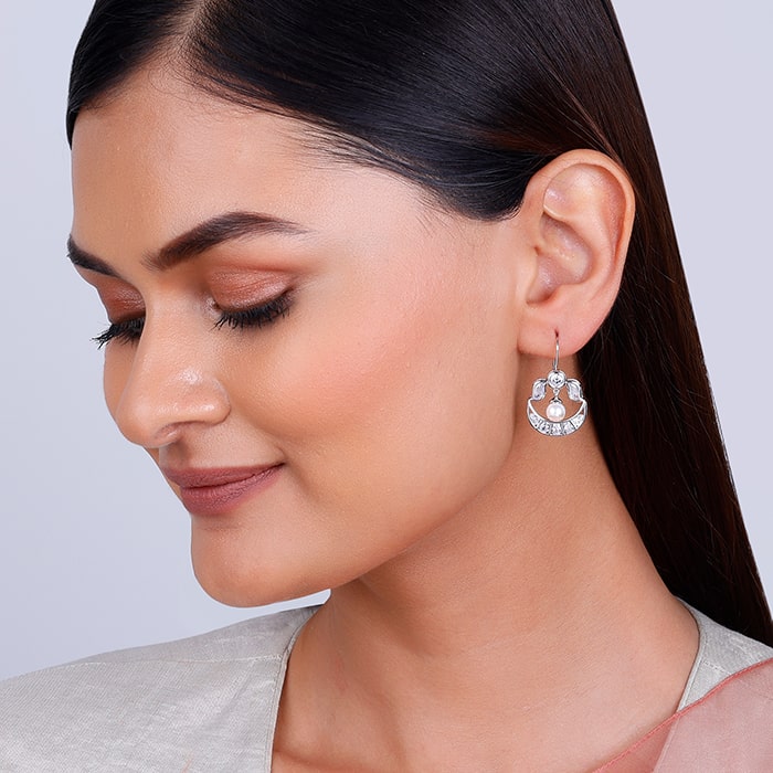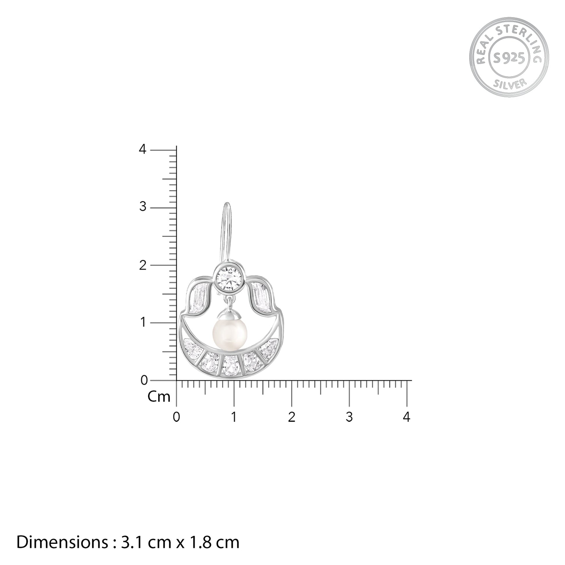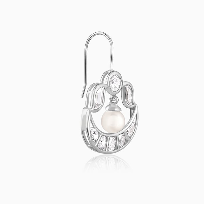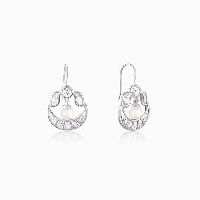 These silver dangler earrings have a unique design studded with zircons featuring a pearl in the centre.