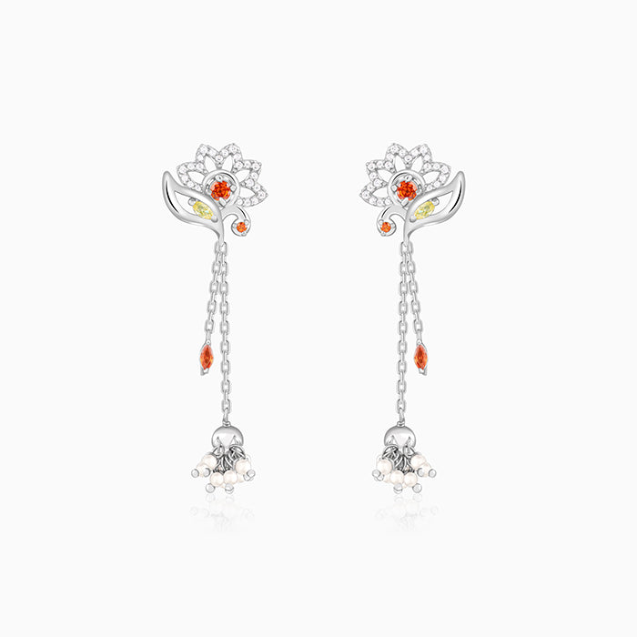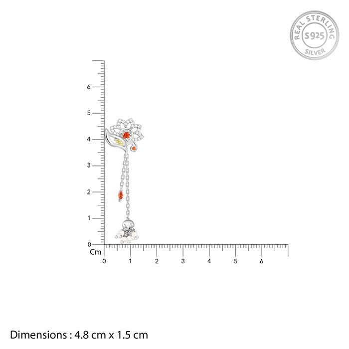 These silver dangler earrings for women feature a leaf and flower motif. Both motifs are studded with colourful zircons and zircons. The dual-link chain below, one has a coloured zircon and the other with a cluster of pearls. Designed in Italy. Inspired by India. Embrace the goddess within with the Shakti Collection by Trendy Freak x Anna Giulia Chicco.