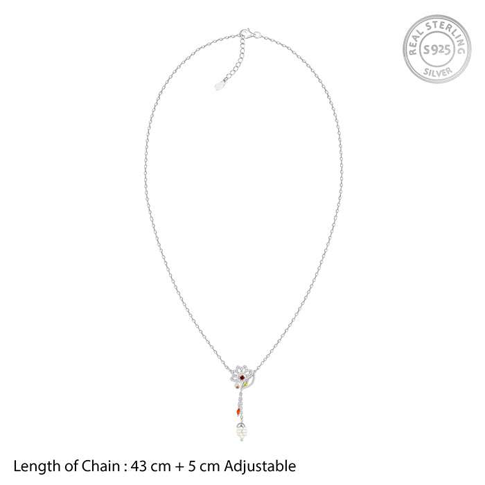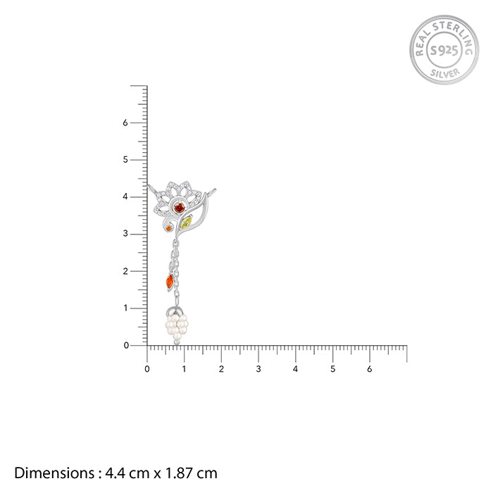 This silver lariat necklace for women features a leaf and flower motif. Both motifs are studded with colourful zircons and zircons. The dual-link chain below, one has a coloured zircon and the other with a cluster of pearls. Designed in Italy. Inspired by India. Embrace the goddess within with the Shakti Collection by Trendy Freak x Anna Giulia Chicco.