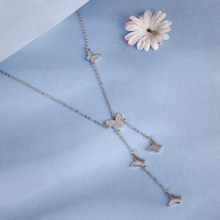 Bring a touch of whimsy to your look with this playful lariat necklace. Multiple butterfly charms, some in silver, others paved with zircon stones cascade down the chain for a fluid, ethereal look.