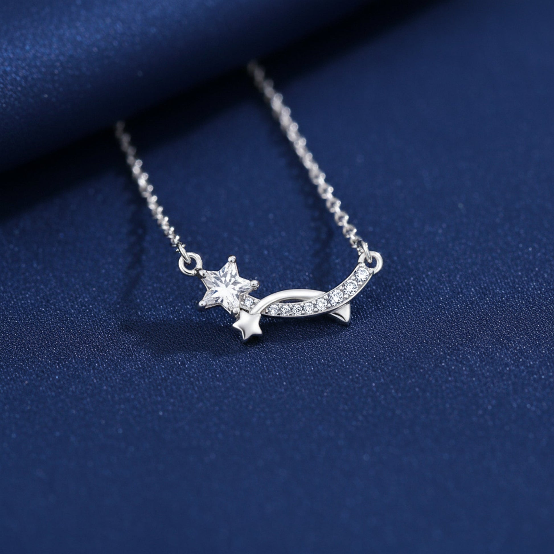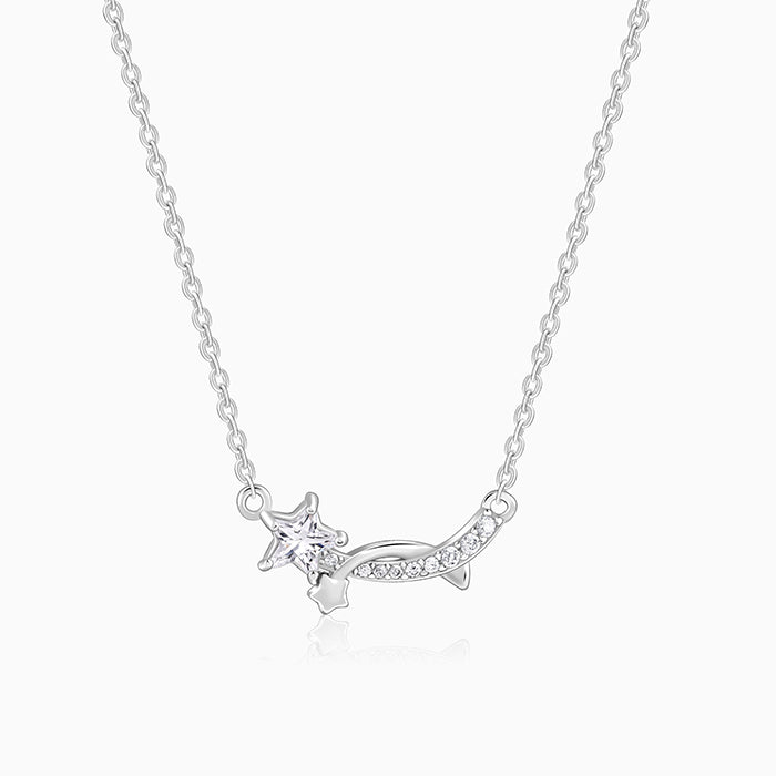 Wish upon a celestial dream with this charming piece, inspired by a shooting star streaking across the night sky. This silver pendant features a sparkling star motif with a curved tail, fully paved with zircon stones for extra sparkle.