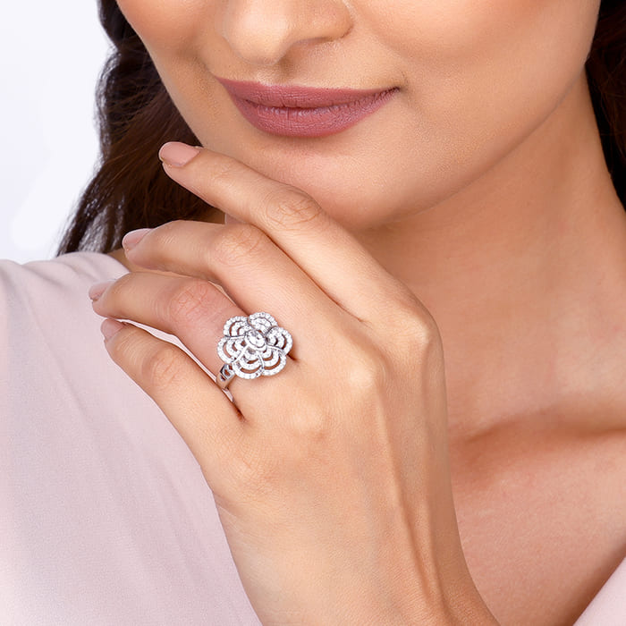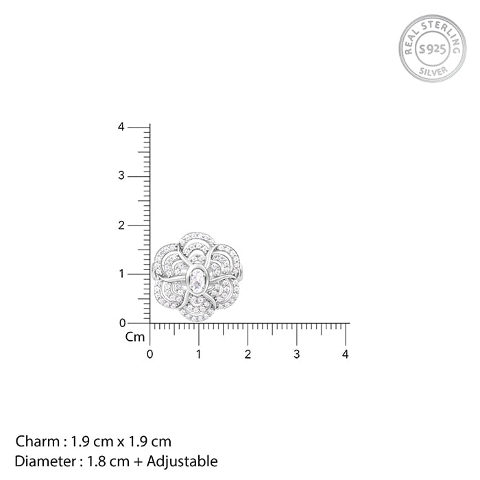 This silver ring has an intricate flower motif with a large zircon in the middle and wave-like designs studded with zircons.