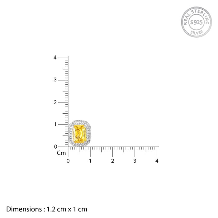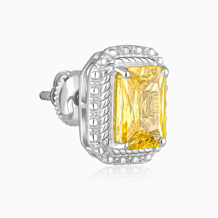 These silver pair of earrings have a square motif with a yellow-coloured stone placed in the centre with zircons surrounded.