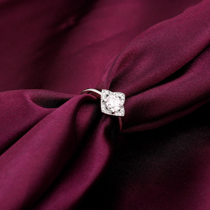 This silver ring has a star-shaped motif with zircons studded and a big zircon placed inside.