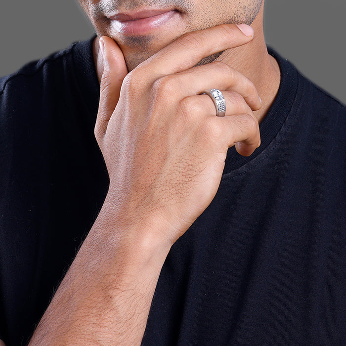 This silver ring for men features a square design with a central zircon, flanked by smaller zircons set along the band.