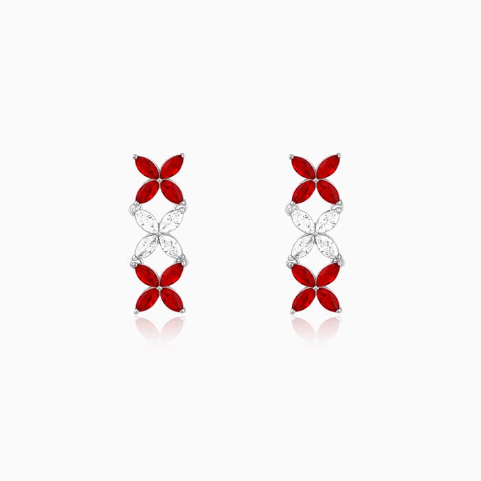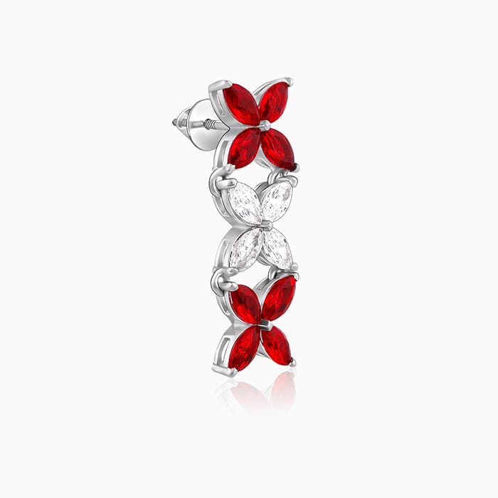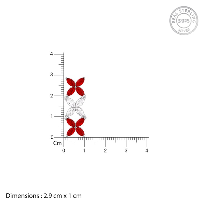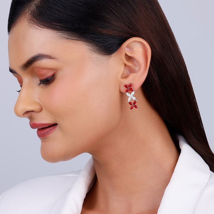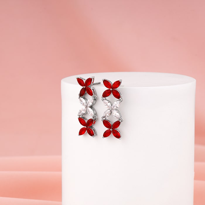 These silver earrings feature four petal motifs studded with zircons and red stones in alternate arrangements, connected in a criss-cross design sporting three petal motifs, with stones at their nodes. Celebrate your moments of passion with Trendy Freak’s Red Romance Collection.