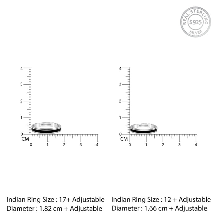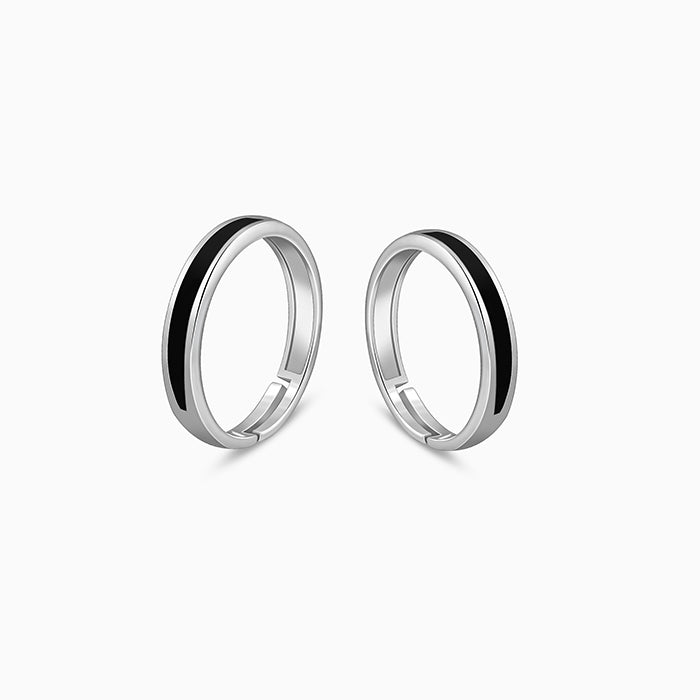 These silver couple rings feature two plain adjustable bands with a channel setting. The centre is filled with black enamel.