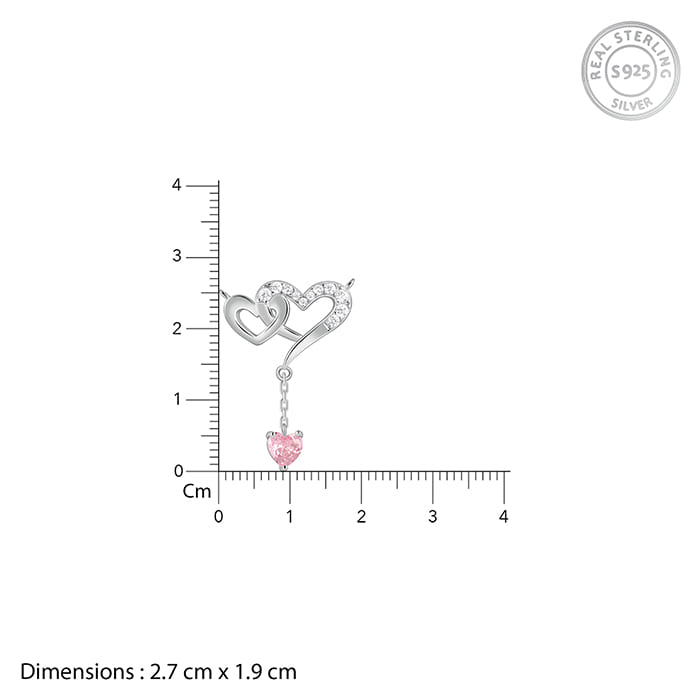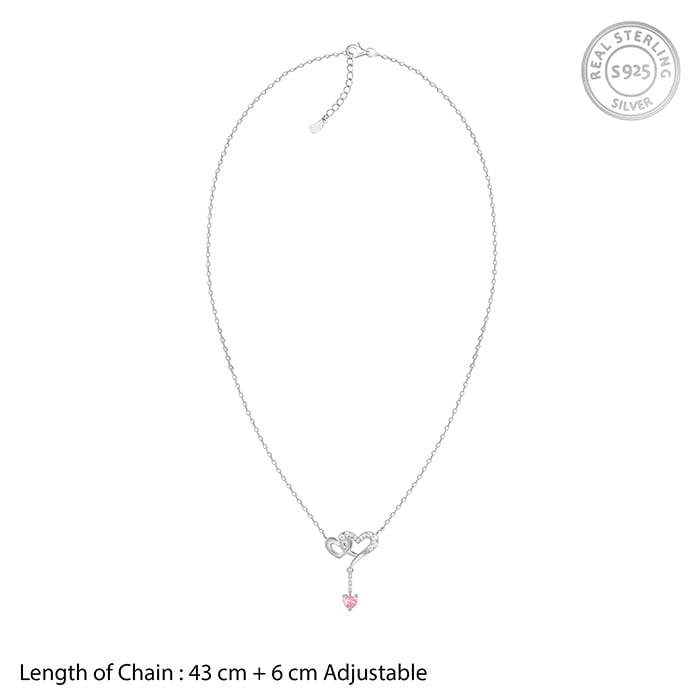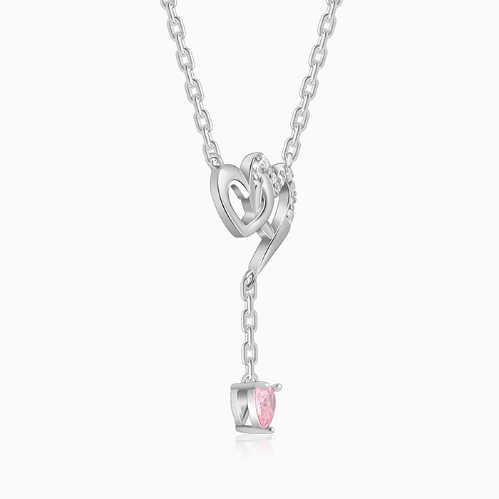 This silver necklace for women features two smaller hearts—one heart set with zircons, while a pink-coloured heart dangles from it.