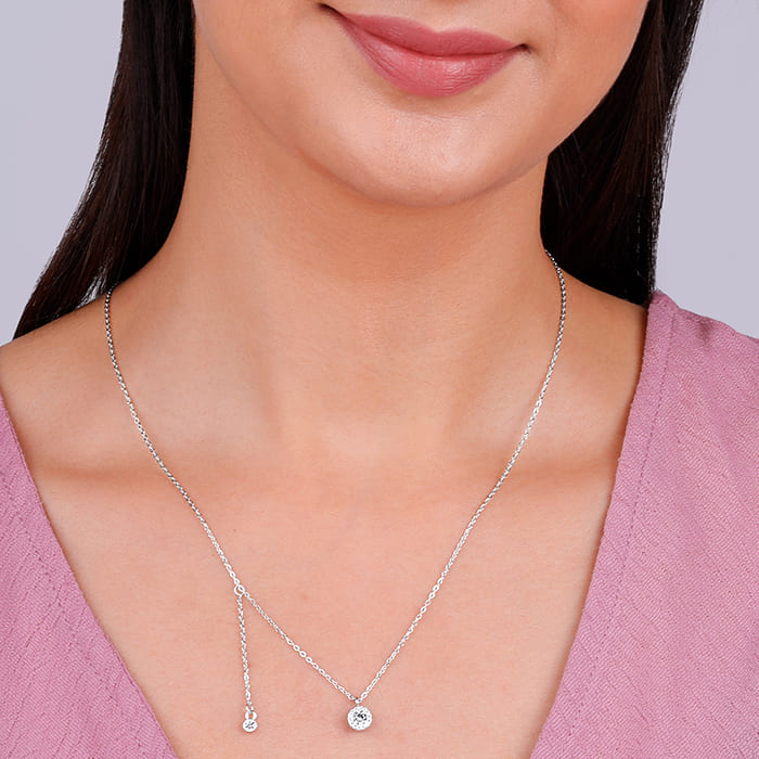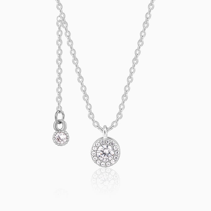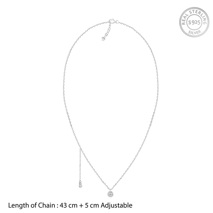 This silver necklace features a circular motif at the centre with zircons. There is a dangling chain with a small circular motif also studded with zircons attached to it which can be adjusted.
