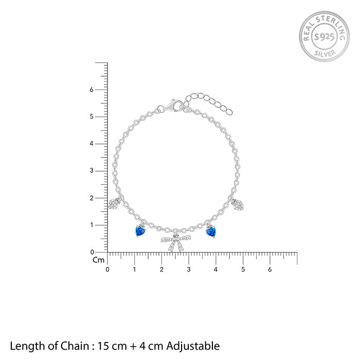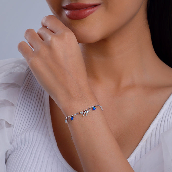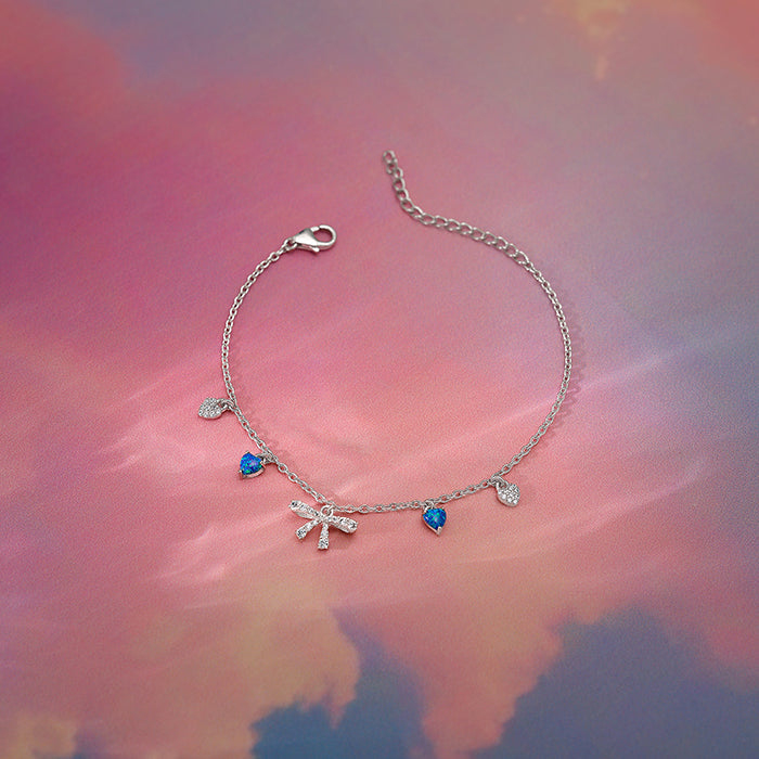 This silver bracelet features a classic link chain with bow and heart charms, studded with zircons and blue opal stones. Let the stunning elegance of Trendy Freak Sky High inspire you to chase every dream and celebrate every milestone.