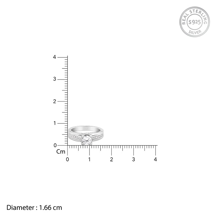 This silver ring features a trellis head nestling a circular zircon on a band that has zircons on top and sides of the shank.