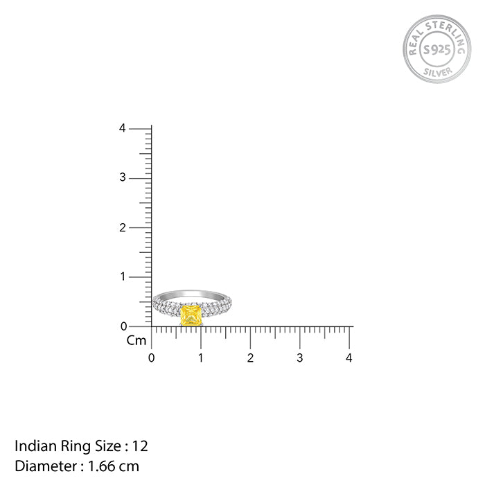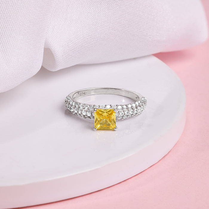This silver ring for women features a centre princess-cut yellow coloured stone. The band is encrusted with rows of shimmering zircons.