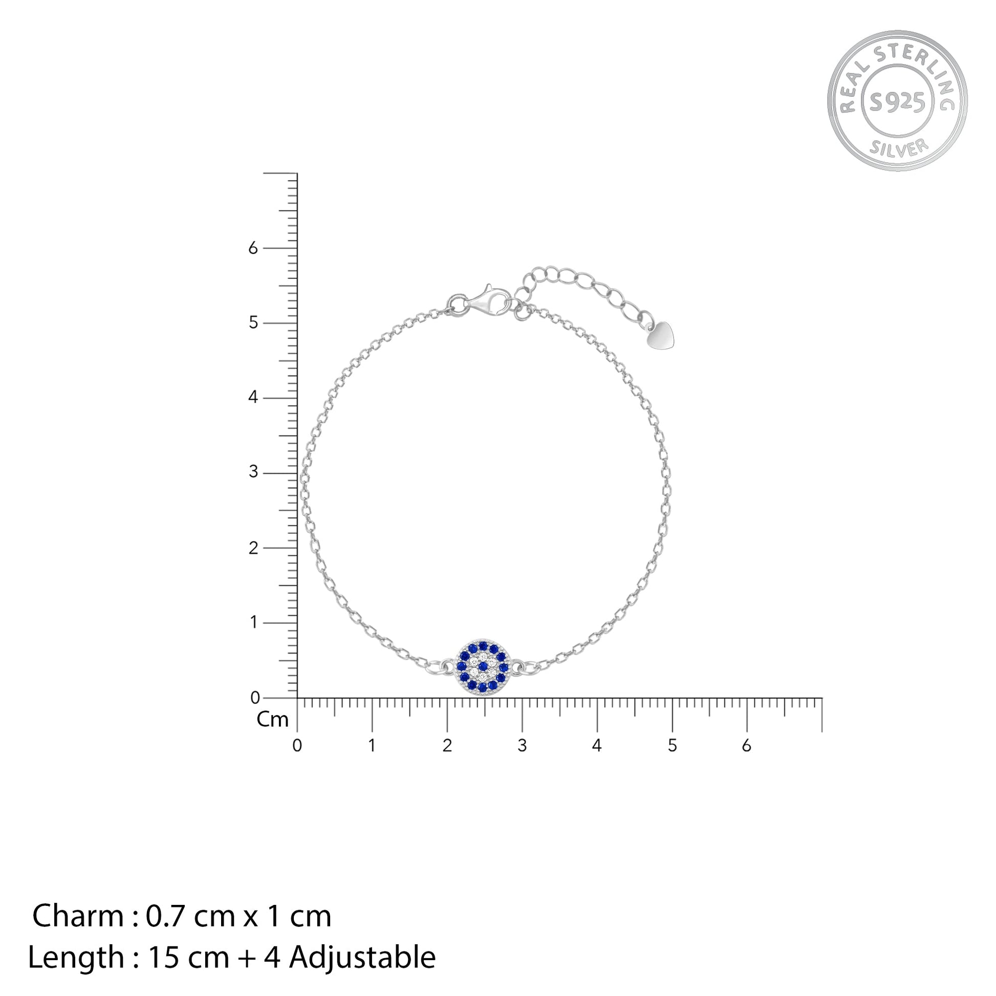This silver bracelet has a blue-coloured zircon-studded rim with a tiny blue zircon in the centre giving it the effect of an evil eye.