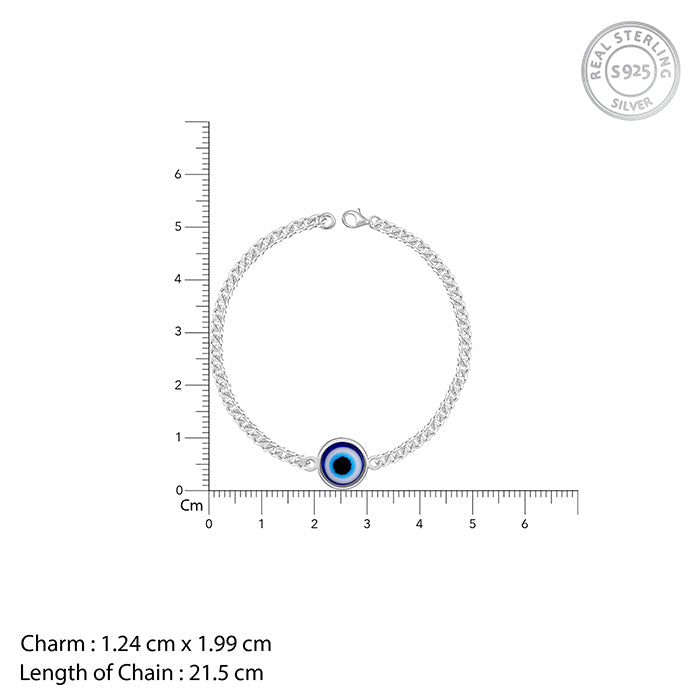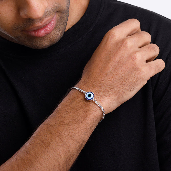 This silver bracelet for men features a link chain design. It has an enamel evil eye motif at the centre.