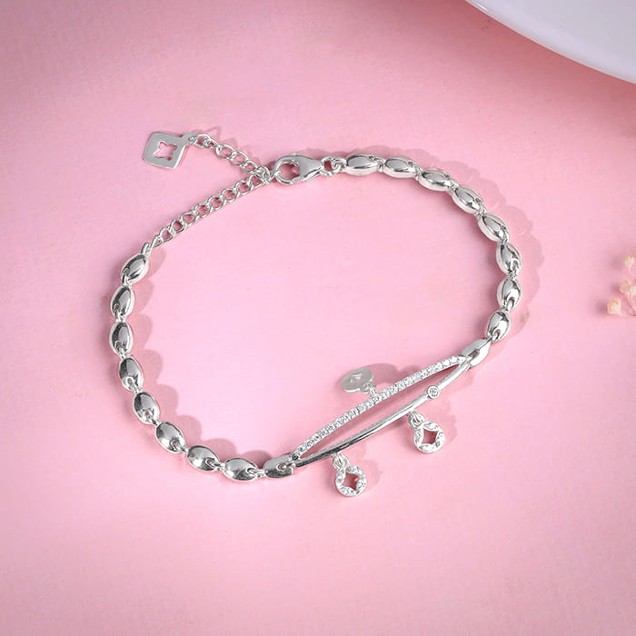 This silver bracelet for women features a unique, curved bar design at its centre, embellished with zircons and a central teardrop accent. The chain is composed of interconnected, elongated oval links, creating a modern and stylish look.
