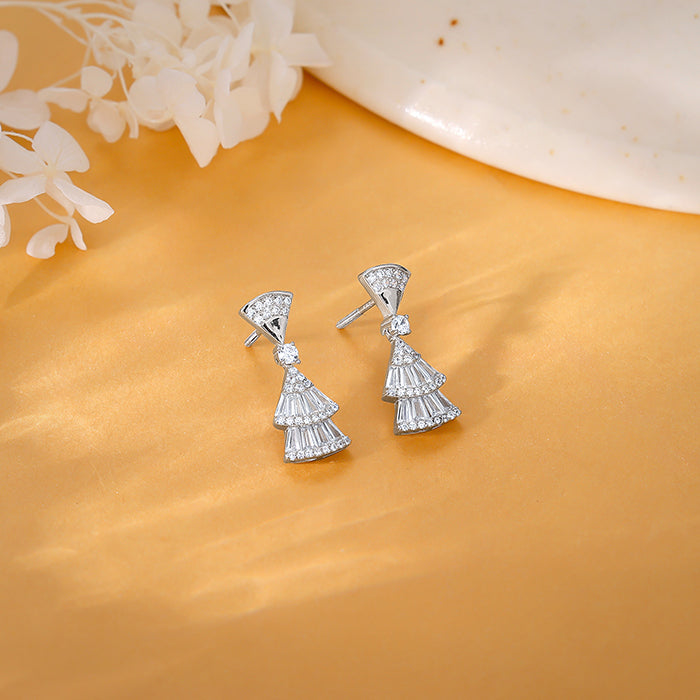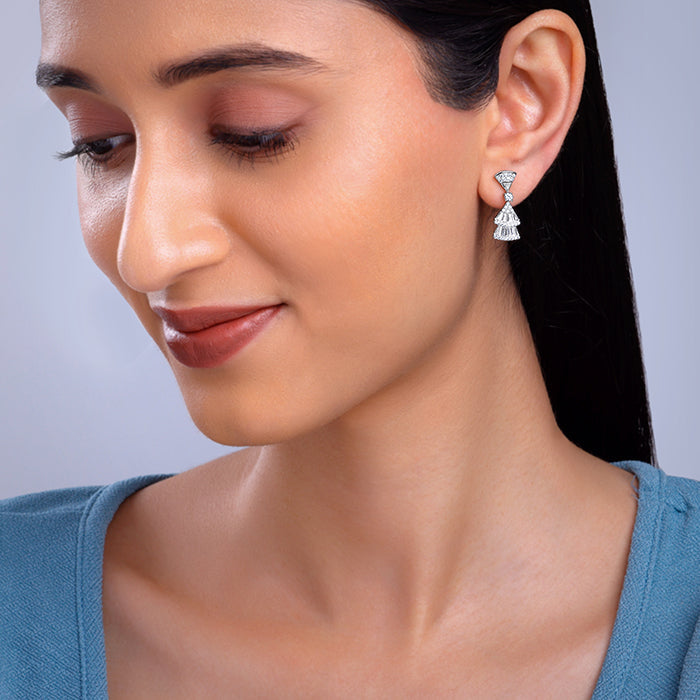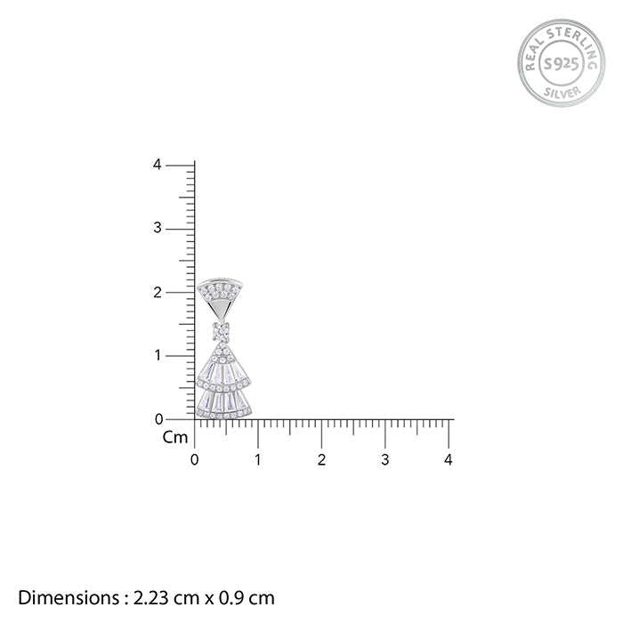 These silver earrings for women feature two inverted triangle motifs hanging from an upper dangle which are studded with zircons.